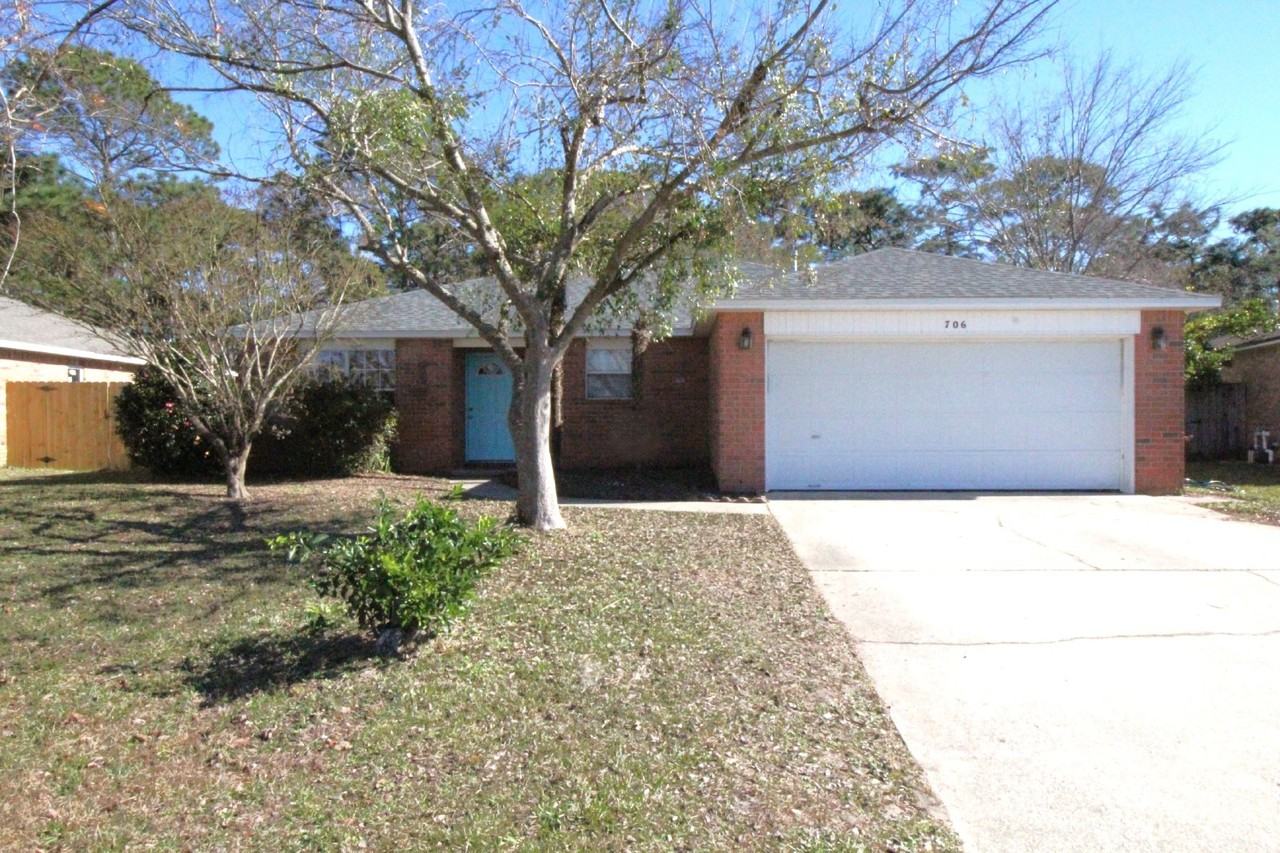 This 3-bedroom, 2-bathroom brick home, located in the desirable Emerald Shores subdivision just outside the back gate of NAS Pensacola, offers a comfortable living space with an additional office/study and a 2-car garage. The home features wood plank flooring throughout, with vinyl tile in the wet areas, ensuring no carpet to maintain. Upon entry, you'll find a versatile office that could easily serve as an extra bedroom. The updated eat-in kitchen boasts stainless steel appliances, including a side-by-side refrigerator, dishwasher, built-in microwave, and electric stove, along with granite countertops and a closet pantry. The large living room, with vaulted ceilings, leads to an open patio and a private, fenced-in backyard. The primary bedroom suite offers a ceiling fan, an ensuite bathroom with a double vanity, a garden tub/tub-shower combo, and a walk-in closet. The two additional bedrooms are generously sized and share a full bathroom with a tub/shower combo. For added convenience, the home includes an indoor laundry room with washer and dryer hookups. This pet-friendly property requires owner approval, a $250 non-refundable pet fee per pet, and aggressive breed dogs will not be considered. Realty Masters residents are required to have renter liability insurance, which can be added for $11.95/month, or you can opt into the Resident Benefits Package (RBP) for $45/month, which includes renter liability insurance, HVAC air filter delivery, and on-demand pest control. Active duty military receive 1/2 off the deposit! The home is currently occupied and will be available for move-in on January 17th.