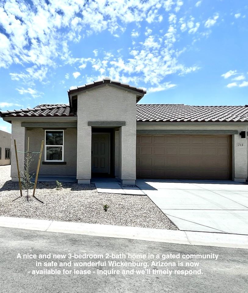 A new 3-bedroom and 2-bath home in the Arroyo Vistas gated community in safe and wonderful Wickenburg, Arizona. Everything is brand new including vinyl plank flooring and carpeting in the bedrooms, kitchen appliances, washer and dryer, HVAC unit, water heater and garage door with automatic door opener. A spacious 2-car garage keeps your vehicles protected from the hot Arizona sun and extreme temperatures. A large fenced backyard gives you outdoor breathing room. The light and bright interior colors give you a compatible pallet for your furniture and decorating accessories colors. Be the second to live in this immaculate new home. It's offered as the best home for rent for the price in Wickenburg. If you can find a better home for the rental price, get it before it's gone! Tenant pays all utilities. Smoking is not allowed. We don't accept pets. Express your interest with an inquiry via Zillow. Provide a contact telephone number and the best time to contact you for a brief and required telephone conversation. This allows is to learn about you and your housing needs. It allows us to answer all your questions. Then, if you're still interested, we'll send you a short video tour for your viewing. If you're still interested, we'll then arrange for your private viewing. After the private viewing, we can send you an application to compare and submit. Wishing you the best in your housing search journey.
