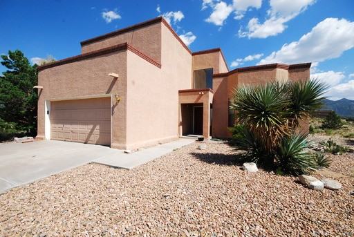 Top of the mountain is the setting for this pueblo style home on 2 acres. The 360’ views are spectacular. Just 2.3 miles north of I-40, Santa Fe is just 30 minutes north and Abq 20 minutes south. Close to the Rail Runner station and all the business on Highway 550. This home features high ceilings in the living and dining rooms, cozy den with wood stove, all appliances and window coverings. Three bedrooms upstairs, large master with private bath and balcony. Patio with amazing views of the Sandias. Master Cool air, all electric, 2-car garage. Call Liz for more information or to schedule a showing, (505) 250-1250.
