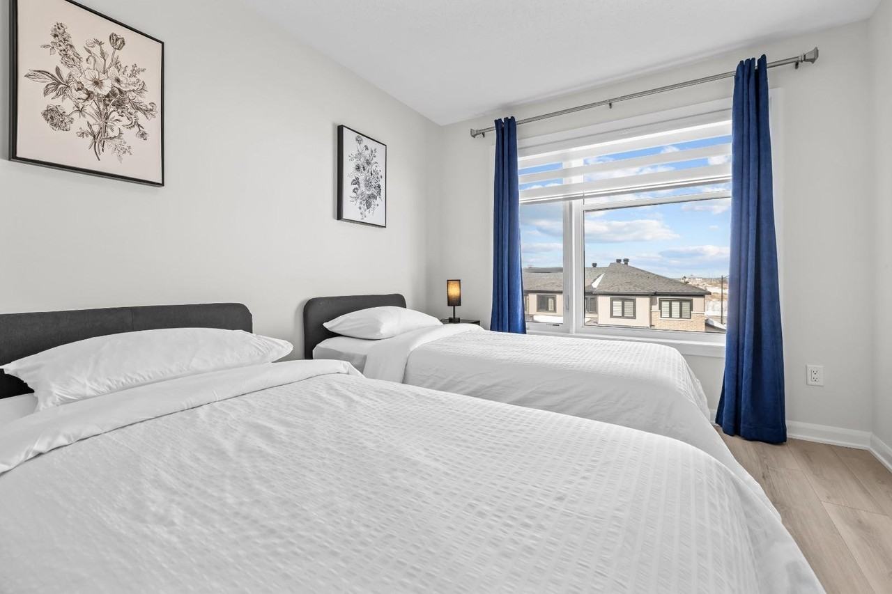 WELCOME To this stylish large new house in the upscale safe neighbourhood of Barrhaven, Ottawa. Perfect for families, co-workers, friends and executives who wish to work from home. GREAT LOCATION8 min to Amazon,Costco,416hwy and Minto Sports Centre9 min to Barrhaven Town Centre with all major stores & restaurants.14 Min to Via Rail – Fallowfield Station.19 min to airport, E&Y Centre23 min to TD Place stadium23 min to Canadian Tire Centre.28 min to downtown. We can't wait to host you!The living room, on the second floor, has a 4K 55" smart TV with built in chrome cast and many channels such as Prime, Roku, Plex and Tubi. It features tv sitting area, dining table ,work desk and 1 powder room,.The kitchen offers quartz countertops, electric range, modern lighting, and top of the line stainless-steel appliances. The kitchen is stocked for cooking, and complimentary coffee and tea. The third level hosts 2 bedrooms: 1 ensuite with a bathroom and a walk-in closet, 1 bedroom with closet, 1 full bathroom. The ground floor has the laundry room. The attached garage accommodates one car and the driveway accommodates 1 car. Central heating and cooling.