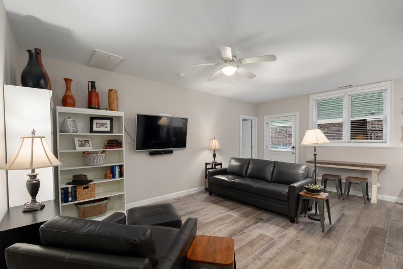 Property Id: 823099 Beautiful daylight basement apartment in downtown historic district. Safe, quiet neighborhood. Apartment dwelling that feels like you live in a home not an apartment complex. Garage included with space for one car. Stainless steel kitchen appliances including dishwasher, stove and refrigerator. Luxury tile plank flooring in living Beautiful daylight basement apartment in downtown historic district. Safe, quiet neighborhood. Garage included with space for one car. Stainless steel kitchen appliances including dishwasher, stove and refrigerator. Luxury tile plank flooring in living and kitchen, tile flooring in bathrooms, carpet in bedrooms. Two bedrooms each with en-suite bath. Wifi access included in rent. Renter pays water and electric. Main house (upstairs) operated as an Air BnB. About one mile from downtown and from NCSU. Washer and dryer in unit. Private porch with room for grill and outdoor seating.