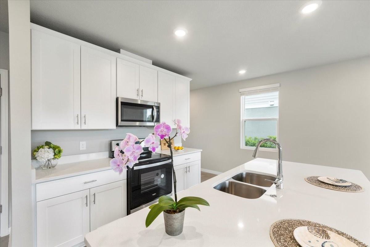 All appliances are included. This 2023 built End townhome, with premium LAKE VIEW, features 3 beds | 2.5 baths | 2 car garage nestled in the prime location of Champions Gate offering an exceptional living experience. This *energy-efficient* home featuring 15 SEER AC, & dual pane low-E windows. This new community is a SHORT DISTANCE from I-4, with an abundance of retail, dining, major employment centers, and recreation areas, including Walt Disney World, Universal Orlando, Omni Resort, Posner Park, and Celebration. As you walk inside, you'll be greeted by an open-concept main level that combines style and functionality. The spacious layout creates an ideal space for entertaining, with the kitchen island serving as the perfect centerpiece for gatherings with friends and family. Prepare delicious meals while staying engaged with your guests, making memorable moments. On the upper level, you'll be greeted by a thoughtfully designed space that caters to your convenience. A laundry room equipped with a full-size washer and dryer makes the task of managing your household a breeze. Additionally, a versatile loft area provides a flexible space that can be utilized to suit your needs, whether as a cozy relaxation spot, a home office, or a play area. The Owner’s Suite offers a serene sanctuary featuring a generously sized walk-in closet to accommodate your wardrobe and belongings. The owner’s bathroom features a spacious Walk-in Shower, dual sink, Quartz counters, and built-in shelving. Two additional bedrooms share the guest bathroom. The home has elegant interior finishes including 42” cabinets, Quartz counters, ceramic tile on the main level and all wet areas, and carpet in the bedrooms. 2” faux wood blinds come in every room. Enjoy Florida living at its best!