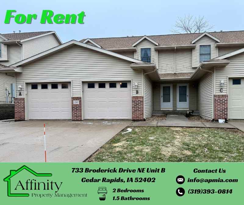 Spacious 2-bedroom, 1.5-bath townhome featuring a 1-car attached garage. The main level offers an open and inviting living space perfect for relaxing or entertaining, while the lower-level family room provides extra room for a home office, play area, or media space. The lower level also includes in-unit laundry for added convenience. Both bedrooms are generously sized with plenty of closet storage. This home combines comfort and convenience, located close to shopping, dining, and parks. Landlord Responsibilities - Utilities and Services: + Snow Removal + Lawn Care Tenant Responsibilities - Utilities and Services: + Electricity: Alliant Energy - Monthly Average: $67.05** + Gas: MidAmerican - Monthly Average: $44** + Water/Sewage/Recycling/Garbage: - City of Cedar Rapids - Monthly Average: $90** **Monthly Average varies with individual use and may not accurately reflect average costs. Pet Details: Pet(s) Allowed: Limit of 2 Cats or 1 Dog | Up to 35 lbs | Breed Restrictions Apply | Updated Vax Records Pet Fee(s): $40 Per Pet/Per Month Affinity Property Management is proud to offer deposit-free living to qualified renters through Obligo! We understand that moving costs can add up, so we want to extend financial flexibility to our residents. When you move in with us, you can skip paying a security deposit and keep the cash for activities you care about. Additional Disclaimers: *Application Fee(s): $40 Per Adult *Application Process consists of credit and criminal background check, income requirements, and rental reference checks. *Affinity Property Management reserves the right to deny applicants with a previous eviction, unpaid balances, and criminal history. *Advertisement photographs and/or videos may be of a similar property. Affinity Property Management uses Tenant Turner to schedule all showings online. https app tenantturner com listings affinitypropertymanagement