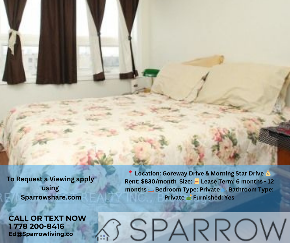 *Inquire Now: For fastest response, text me at +1 778 200 8416** Modern Cozy Room for Rent – Mississauga Welcome to Nieva’s home in the vibrant neighborhood of Goreway Drive, Mississauga! This comfortable and modern shared rental provides access to shared spaces such as a backyard, kitchen, and balcony, offering a peaceful and convenient living experience. With included utilities and amenities such as air conditioning, heating, a washer, and a gym, this home ensures a stress-free stay. Plus, bicycle parking is available, making it easy to explore the surrounding area and nearby attractions. Home Details: 🏡 Home shared with: 2 Adults 🚫 Pets: Not Allowed 📍 Location: Goreway Drive & Morning Star Drive 💰 Rent: $830/month 📅 Availability: April 27, 2025 📏 Size: 📜 Lease Term: 6 months - 12 months 🛏 Bedroom Type: Private 🚿 Bathroom Type: Private 🛋 Furnished: Yes 🛌 Bed Type: Queen Bed What This Home Offers: ✅ Utilities & Amenities: Air Conditioning Heating Washer Gym Elevator ✅ Shared Items: Dishes & Silverware Pots & Pans Clothes Washer/Dryer Stove Fridge Microwave ✅ Parking & Facilities: Free on-premise parking Bicycle Parking ✅ Shared Spaces: Bathroom Backyard Kitchen Balcony House Rules: 🚫 Guests: Daytime Guests Allowed, No Overnight Guests 🚭 Smoking: Not Allowed 🚫 Vaping & Cannabis: Not Allowed 🐾 Pets: Not Allowed Payment: Security deposit after signing the agreement, then pay the 1st month's rent before move in-date. The security deposit will be returned at the end of the lease term, conditional on the property being left in its original condition, minus normal wear and tear. 📜 Rental Requirements ✔ Copy of ID ✔ Credit Check ✔ If Student: Proof of Enrollment ✔ If Employed: Proof of Employment and/or Income ✔ Minimum 2-month rental agreement ✔ First month’s rent + security deposit required ✔ Non-smoker, preferably a student or a professional Tenant Insurance Included: Renting through Sparrow includes tenant insurance at no extra cost, providing you with added peace of mind. Credit Building: Your rent payments through Sparrow will be reported to credit bureaus, helping you build and boost your credit score over time. Disclaimer This listing has been syndicated from sparrowshare.com, including its content, rental terms, and images. Sparrow is used to verify the identity and compatibility of those interested. The advertised property is owned and/or managed by Ed from Sparrow Living Inc.