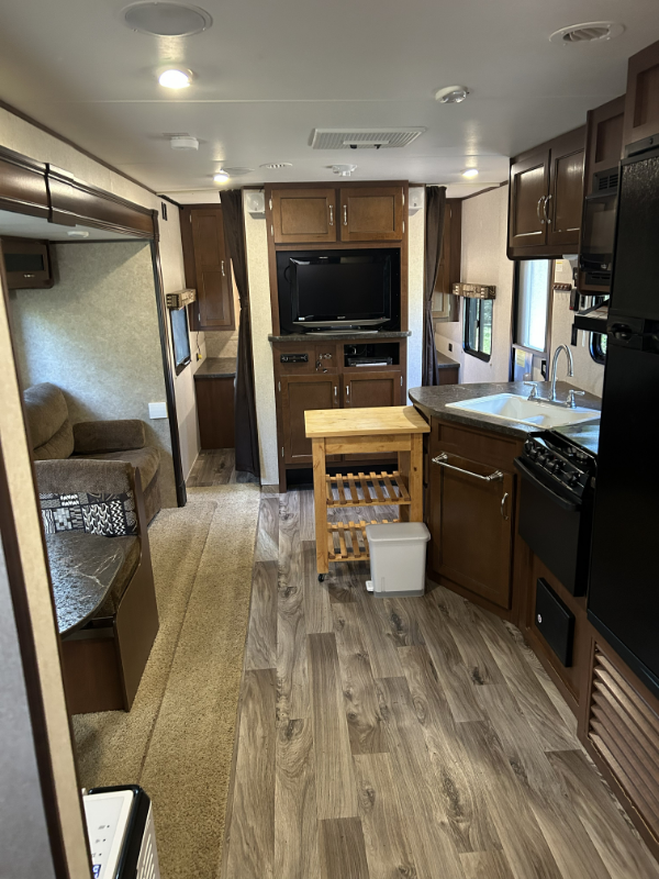 Property Id: 2381995 Cozy 2017 Jayco Flight 27ft. travel trailer with slide out room. Tucked away off the beaten path in a private tree-lined space next to a family home in a quiet neighborhood. The newly installed tankless water heater provides endless hot water. Connected to filtered drinking water and the family home septic system means you don't need to worry about the RV tanks filling up or needing to be emptied. Built in heater and AC unit keeps the space warm in the winter and cool in the summer. Built in microwave, gas burners and oven with a refrigerator and separate freezer. Queen size bed with an added foam top.