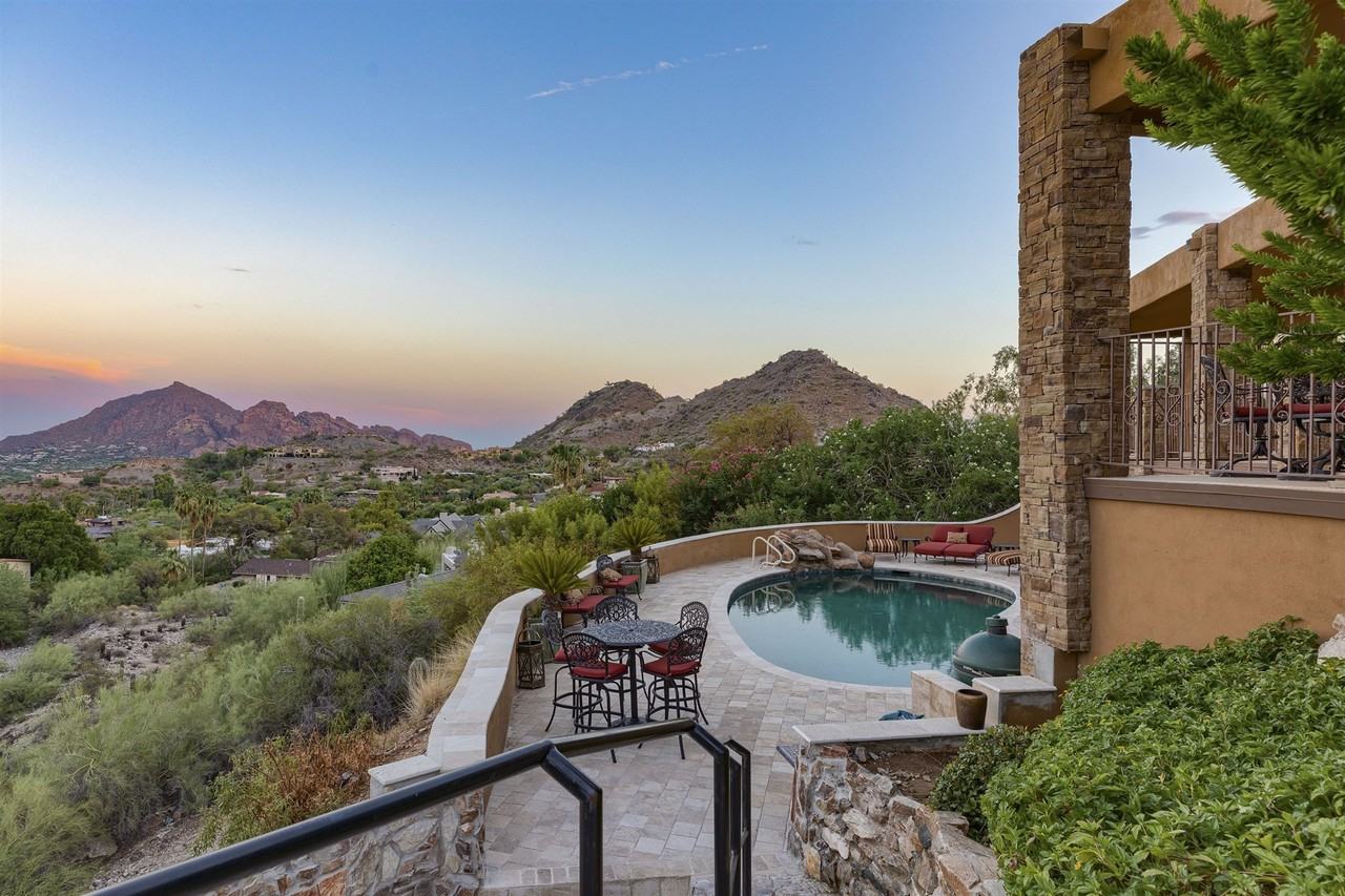 Grand Entry Cupola with Glass & Steel Entrance Door looks through floor to glass sweeping views of Mountains, morning Sunrises and city lights at dusk. Completely remodeled 2014 w/gourmet kitchen, stone floors and high ceilings! Sports Enthusiast has full entertainer's Theater w/4k Projector Screen AND 2 adjacent 4k Curved Flat screen TVs! Lower level bonus room opens to pool with a Billiards Table, a Card Room and adjacent Wine Cellar and additional guest rooms. The master, kitchen, library, garage and front door entrance are all on main floor. Split bedroom wing provides private ensuite bathrooms and balconies with views. Split guest suite or second master off foyer. Chef's kitchen includes double oven, steam oven, built-in coffee, oversized island and separate coffee/wet bar. An entertainers dream continues out to the pool area with built-in BBQ, frig, misting system, fire pit.