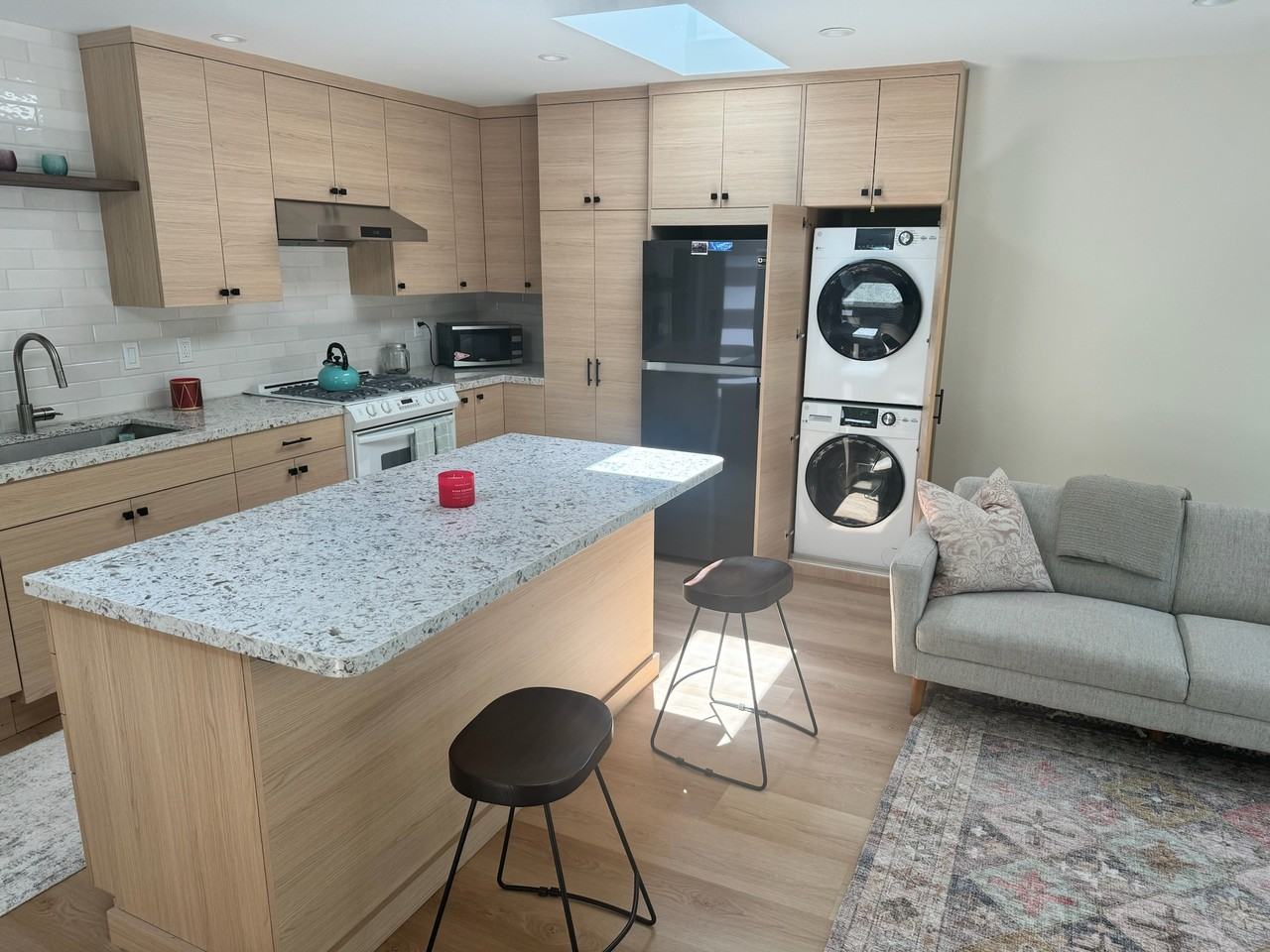Newly remodeled 1-bedroom sunny, charming Casita (700 sq. ft) nestled in the hills above San Anselmo. Short walk to Sleepy Hollow / Terra Linda Ridge. Lovely and quiet space with all new furnishings and appliance package (dishwasher, in-unit washer/dryer, HVAC), hardwood floors, private patios in front and back. The unit comes partially furnished (optional). Designated off-street parking. Some storage on property. A must-see! Available now. Rent: $2950 per month, plus $150 mo. utilities. WiFi / Cable & Garbage not included. First & last month, plus 1 month security deposit. Single Person or Couple welcome. NO SMOKING.