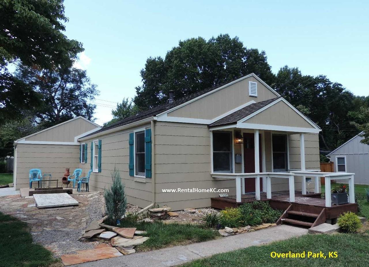 This house is as charming as they get. Total remodel with new hardwood flooring, paint, tile and more. Two bedrooms and one full bath. Kitchen with updated cabinets, stylish backsplash, new plumbing. Refrigerator, washer and dryer are provided. True ranch with all living space on one floor. Long attached garage plus nice shed. Large level corner lot near downtown Overland Park. Sorry, No pets.