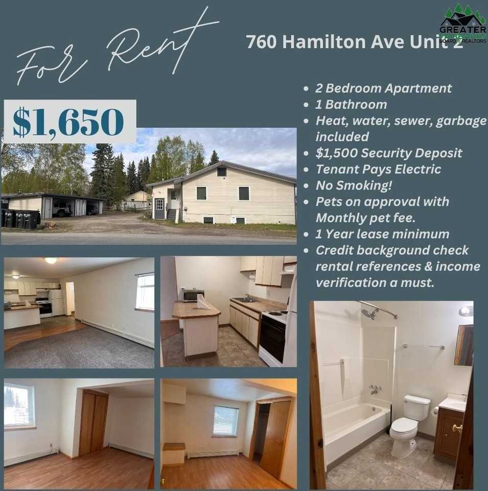 Property Status: Active This is a lovely apartment in a quiet sought out neighborhood. Right across from your local coffee shop, drive-thru, to start your mornings. 2 bedrooms, 1-bathroom, beautiful wood flooring throughout. Pets on approval with additional monthly pet fee. Maximum 1 pet! Open living concept. Added storage unit, plus 1 car carport. Rental references and income verification a must! Application required prior to showing, with a $40 application fee once accepted. Office Phone: (907) 347-4720 Copyright © 2025 Greater Fairbanks Board-Realtors. All rights reserved. All information provided by the listing agent/broker is deemed reliable but is not guaranteed and should be independently verified.
