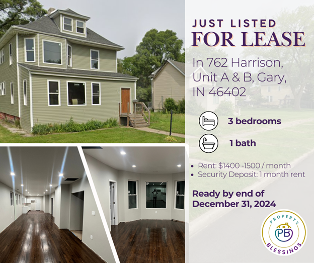 Amazing 3 bedroom, 1 bathroom apartment in Gary. Amenities included: central air, hardwood floors, updated kitchen, updated bathroom, and laundry in building. Utilities included: water. Is not pet friendly. Date Available: Dec 9th 2025. $1,450/month rent. $1,450 security deposit required. Please submit the form on this page or contact Harrison Property at 773-234-2664 to learn more.