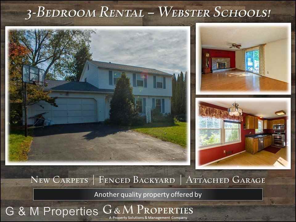 3-Bedroom Single-Family Rental in Webster! - Check out this great single-family home rental in a fantastic Webster neighborhood. You have a living room, dining room and a spacious family room off of the kitchen. Walk out the patio doors onto a large deck, and then continue on to the private backyard that's completely fenced in. Back inside the kitchen you'll find stainless steel appliances, including a built-in microwave above the range that has a double oven as well as a brand new dishwasher. There are brand new carpets throughout the entire house, as well as fresh paint in some of the rooms. Upstairs you have 3 spacious bedrooms and a full bathroom. The house also comes with central air conditioning for your enjoyment in the summer months. The attached 2-car garage gives you the perfect space to keep the snow off your cars in the winter. The basement is large, giving you plenty of space for storage. You'll also find a washer and dryer that's included for your convenience there as well. This is a fantastic location that's close to schools and the village, with easy access to 590 to make for an easy commute. Definitely a must see! Another fine property that is professionally managed by G & M Properties. You'll love living in your own single-family home, and still have all the benefits of apartment living like 24-hour, 1-call maintenance and online rent payment. Call TODAY to schedule a walk-through - this one is sure to go fast! G&M Properties | (585) 568-7275 Monthly Rent starting at $1,695. Please call for details. *************************************************************** See the 360 Tour Here: https gmprop info 767_Somerset_Dr_360_Tour *************************************************************** ------------------------------------------------- **NO Smoking** **Credit Check / Background Check Required** **Additional Monthly Pet Fee required for Pets with approved pet screening** **No Cats - Small Dog Only** ------------------------------------------------- No Cats Allowed