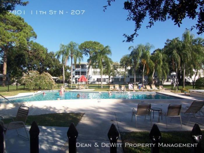 ---- SCHEDULE A SHOWING ONLINE AT: showmojo. com lt e3a458e093 ---- Available now for a move-in within 30 days - 55 community UNFURNISHED 705 sf one bedroom with great bonus room Water, sewer, trash and basic cable included Absolutely gorgeous second floor condo just remodeled with contemporary kitchen that includes quartz counters, stainless range and over-range microwave, dishwasher and bottom-freezer refrigerator. Lots of cabinets and open shelving Large bedroom with a wall of closets has en suite bath and opens onto the bonus room which can be used as an office, guest room or sunny sitting room. Bonus room is bright and sunny with large, new windows L-shaped living and dining area and a half bath for guests New neutral carpet, wood laminate and honeycomb marble tile flooring in full and half bath Fantastic view of well maintained grounds with mature trees, grassy lawn and pool! Heated pool in the center of a shady green space with shuffleboard, tables/chairs, coin laundry facilities, assigned parking. Centrally located, just minutes from 275, a quick 15 minute drive to Tampa or downtown St Petersburg in 10 minutes. Another few miles and you\'ll be on the beautiful, soft and sandy beaches of the Gulf of Mexico. $50 non-refundable application fee for each adult covers credit and background check. Once approved by DDPM, $50 HOA application fee required. $100 administrative fee will be charged upon DDPM approval. The unit will not be reserved for applicant until administrative fee is received by management. Once paid, management will process tenant, create lease, send move in instructions, etc. Security deposit due upon approval; Full first month\'s rent (regardless of move in date) due prior to move in Basic approval requirements include a gross monthly income of three times the rent, a clean background, and fair to good credit All Dean & DeWitt properties are currently transitioning to no smoking properties. No smoking is permitted on premises 12 month minimum lease Provided by Listanza ID 25427950