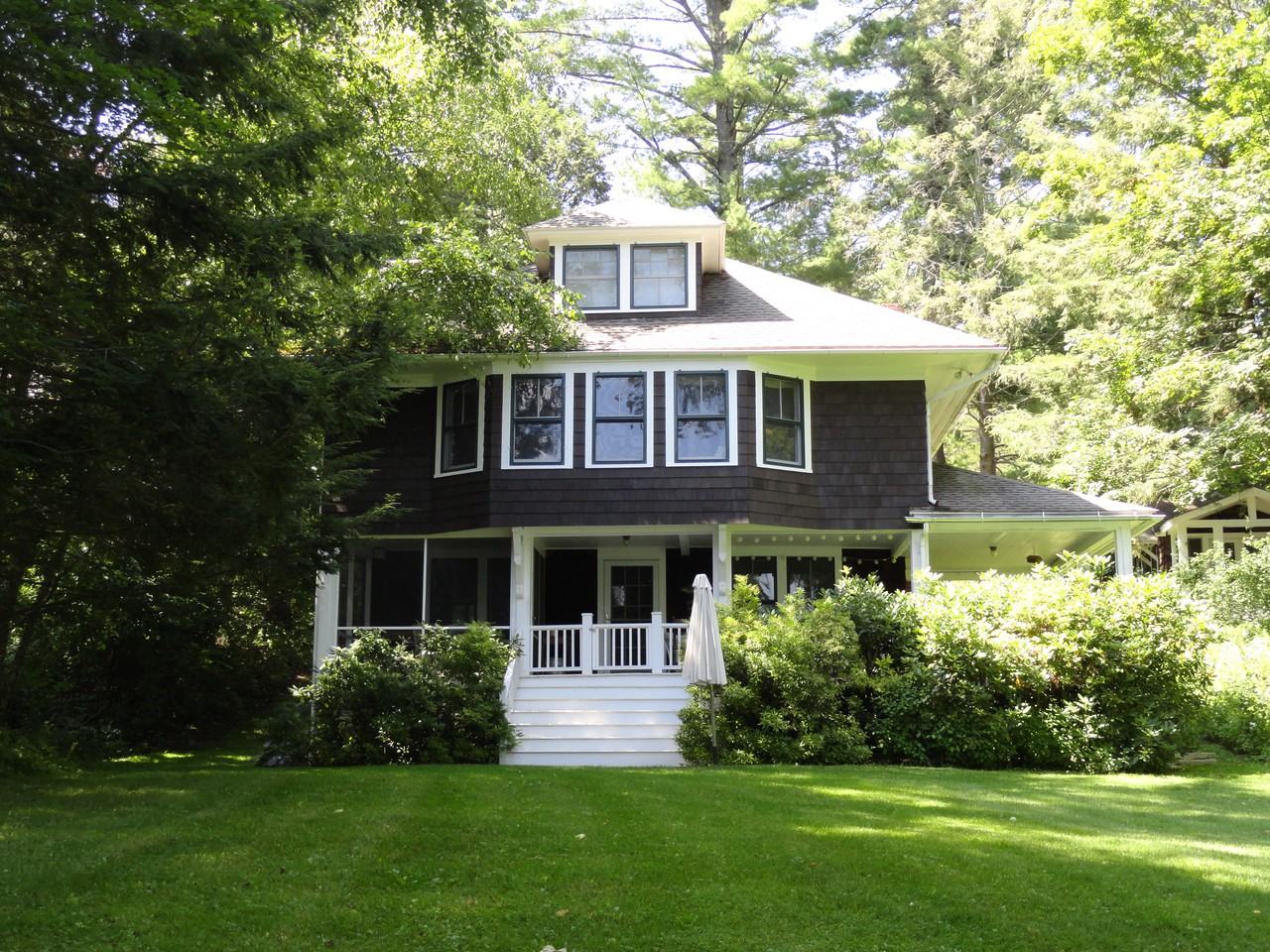 Classic Adirondack style house with direct frontage on the larger of the Twin Lakes. Well appointed interior with lots of character, wood burning stone fireplace and 4BR, including a large master suite with a wall of windows taking in the lake view. Available furnished for winter rental only.