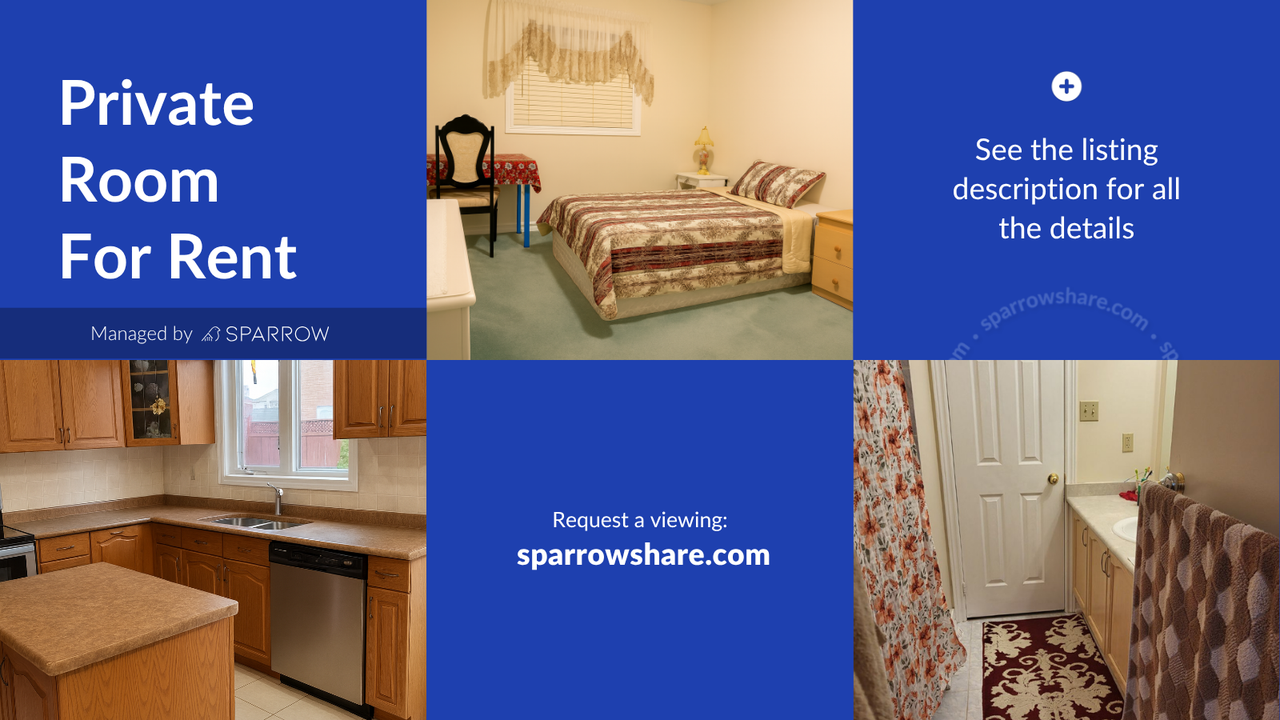 *Text me at 437 291 7980 for assistance using SparrowShare Private room in a shared house at Skylar Circle, Brampton Bedroom available: 1 Furnished Bedroom A: $830 Private room with Double sized bed (Shared bathroom) Solo occupancy only Utilities included: - Heating - Washer & Dryer - Internet - Air Conditioning Shared spaces: - Bathroom - Dining Room - Kitchen - Living Room - Backyard Parking: On Premises Minimum Rent Duration: 4 months Payment: Security deposit after signing the agreement, then pay the 1st month's rent before move in-date Address: Skylar Cir, Brampton, ON L6P 0Z2, Canada Nearest Landmarks (walking distance): Gore Meadows Community Centre & Library Gore Meadows Park Castlemore Village Park Claireville Conservation Area (entrance) House Rules: - No Guests - No Smoking/Vaping/Cannabis - No Pets Allowed Additional Benefits: - Tenant Insurance Included: Renting through Sparrow includes tenant insurance at no extra cost, providing you with added peace of mind. - Credit Building: Your rent payments through Sparrow will be reported to credit bureaus, helping you build and boost your credit score over time. Disclaimer: This listing has been syndicated from sparrowshare.com, including its content, rental terms, and images. Sparrow is used to verify the identity and compatibility of those interested. The advertised property is owned and/or managed by Melvin from Sparrow Living Inc.