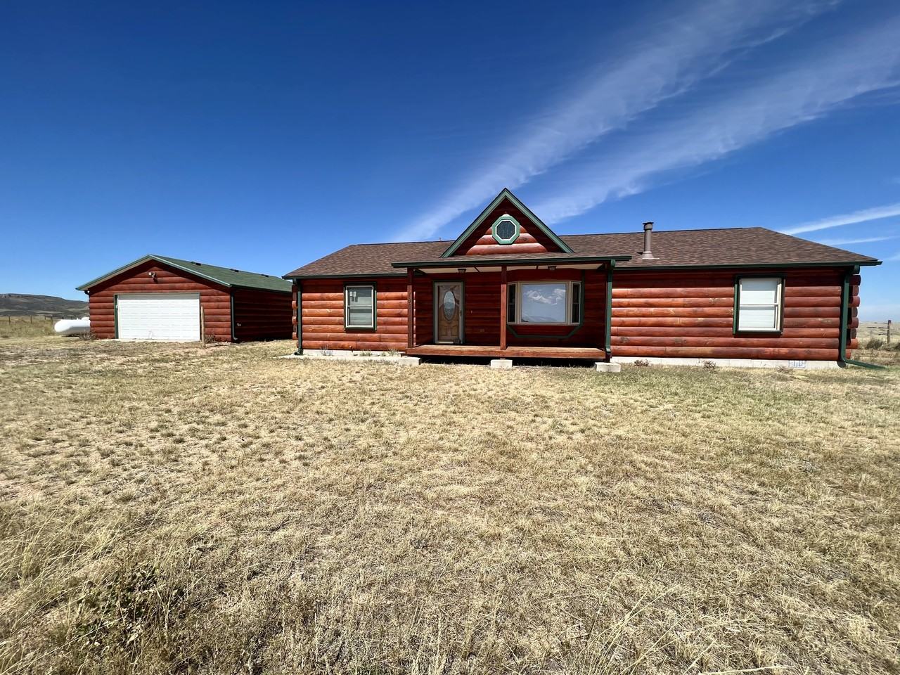 6.82 acre rural log cabin with detached, oversized 2 car garage. 3 bedrooms & 2 full baths. Primary bedroom has a jetted tub & walk-in closet. Large, open kitchen & gas fireplace in the living room. A/C included, as well as washer and dryer. Views abound!