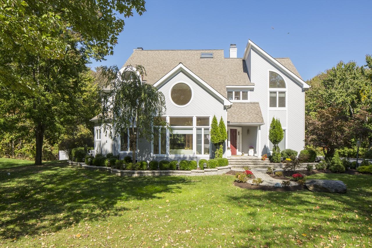 The circular windows and interesting rooflines of this bright and airy modern home bring a dynamic architectural presence to a quiet Skillman street. Blond oak floors flow through the open main level featuring a sunken 2-story living room bathed in light. The sparkling white kitchen with large center island opens to the formal dining room and a cathedral breakfast area. A 3-sided fireplace can be enjoyed from the family room, also with a media alcove and sliders to a large deck suspended above an in-ground pool. Tall trees spread out beyond, gracing the 5-acre property with natural privacy. In addition to a study, a first floor guest bedroom is located next to a full bathroom. Downstairs, in the walk-out finished basement, a wet bar and full bath are great when entertaining poolside. The sweeping main staircase leads up to 3 bedrooms, a shared bath, a big bonus room and the luxurious master suite through double doors. A turret sitting area, sky-lit bath with spa tub and a walk-in closet make the master a true retreat. Also available for sale.