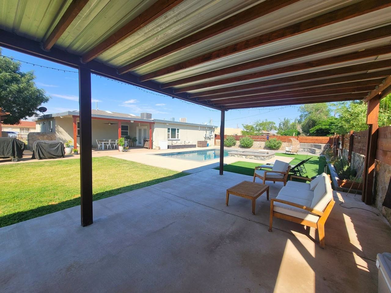 Rentals do not exist like this! Lower Valley Jewel EPCC and Loop 375 close by. Check out photos and here is list of amenities and features. 4 bedrooms, 2 baths. Totally fenced .33 acre fully landscaped with real grass. Water bill oops this has irrigation!! Interior Decorators give a stamp of approval on this with hardwood, tile, grey walls, extensive recessed lighting and decorative fixtures. Living room and den with a wow set in fireplace. 3 covered patios in back and the POOL with JACUZZI. Solar panels, you know electric bill is lower. Sum this up, green valley location, beautifully updated and maintained, family and entertaining ready. Who is ready to see this one, you for sure, right?
