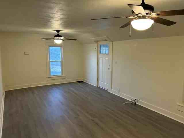 Apartment is a second story, two bedroom, one bathroom apartment with garage. Apartment has new flooring throughout, new cabinets and countertops, new appliances, and updated bathroom.