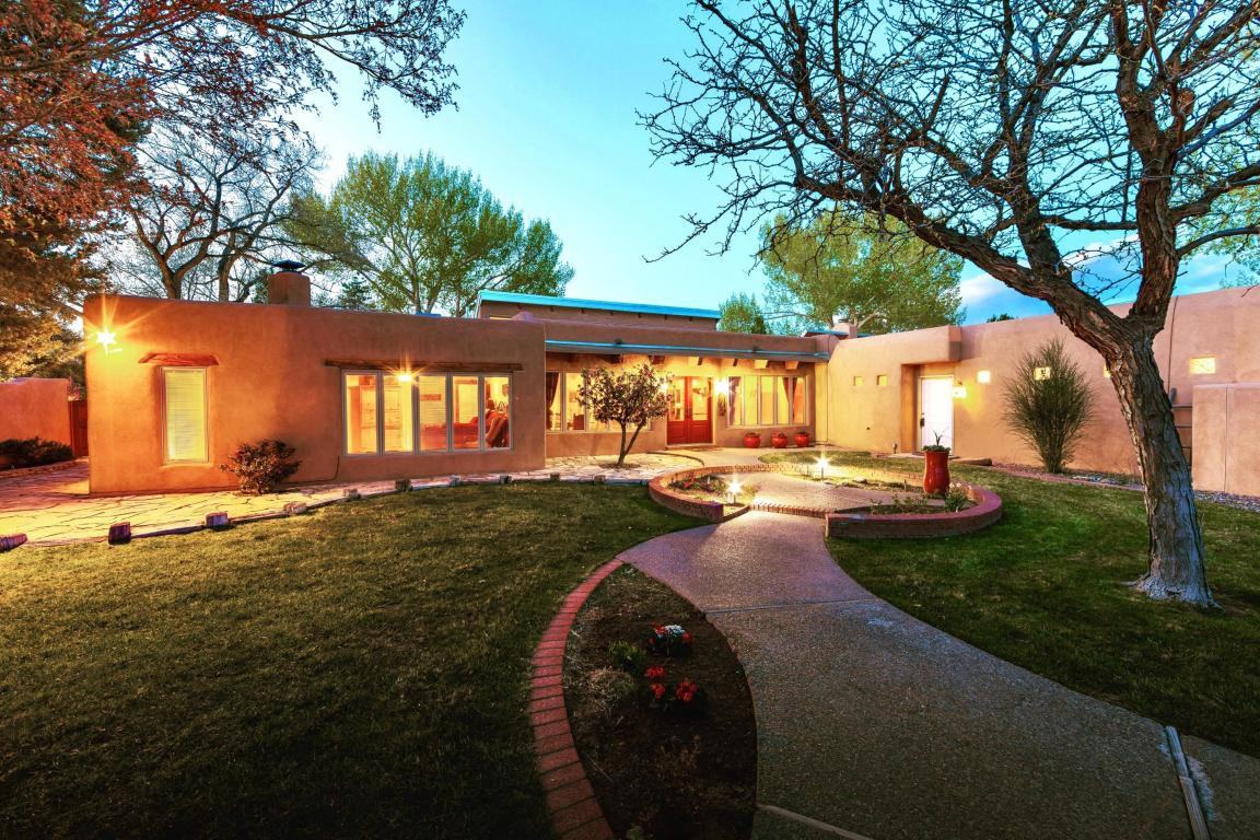 Extremely rare opportunity to lease such a spectacular and spacious home in the heart of Los Ranchos. Flexible and very accommodating floor plan is highlighted by custom features and beautiful southwestern finishes. Natural brick, saltillo tile, wood beams, gorgeous plaster walls, tongue & groove ceilings, and an amazing fully landscaped oasis on over an acre of private grounds. Gourmet kitchen includes a butler's pantry, granite counters, top end appliances, a farm sink and loads of custom cabinets. Large master suite offers true privacy, comfort, and luxury with a double-sided fireplace, sitting area, access to a private courtyard, and a spa like bathroom. Outside enjoy a swimming pool, hot tub, multiple sitting areas, enormous mature cottonwoods, lush grass, multiple courtyards, and a masterfully designed landscape offering perennial color accents year-round. Over an acre on automatic well-irrigation with all grounds maintenance and pool maintenance included with the rent. Call (505) 878-0100 to schedule an exclusive tour.