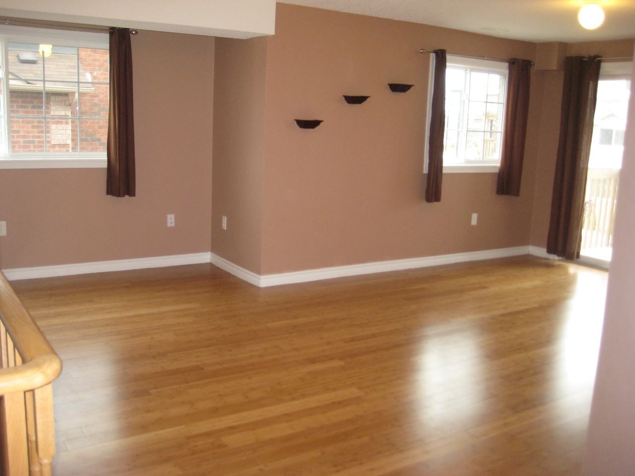 It's a 2 bedroom + den condo just off Yonge Street in Southeast Barrie. It's just a 5 minute walk from the South Barrie GO station. It's close to Highway 400, the beautiful Barrie Lakeshore and Barrie's shopping district. The condo is newly painted in modern tasteful colours, with bamboo hardwood on the main floor. It has five appliances, including dishwasher as well as front loading washer and dryer in the main floor laundry room. You'll have two patios to enjoy; you can barbecue off the dining room, and lounge in the sun off the master bedroom. The condo has central air conditioning and the unit includes one parking lot with an option to apply for another. Upstairs there are two generous sized bedrooms, plus a small den and a large bright bathroom with deep soaker tub and linen closet. Rent $1250/month + hydro & gas