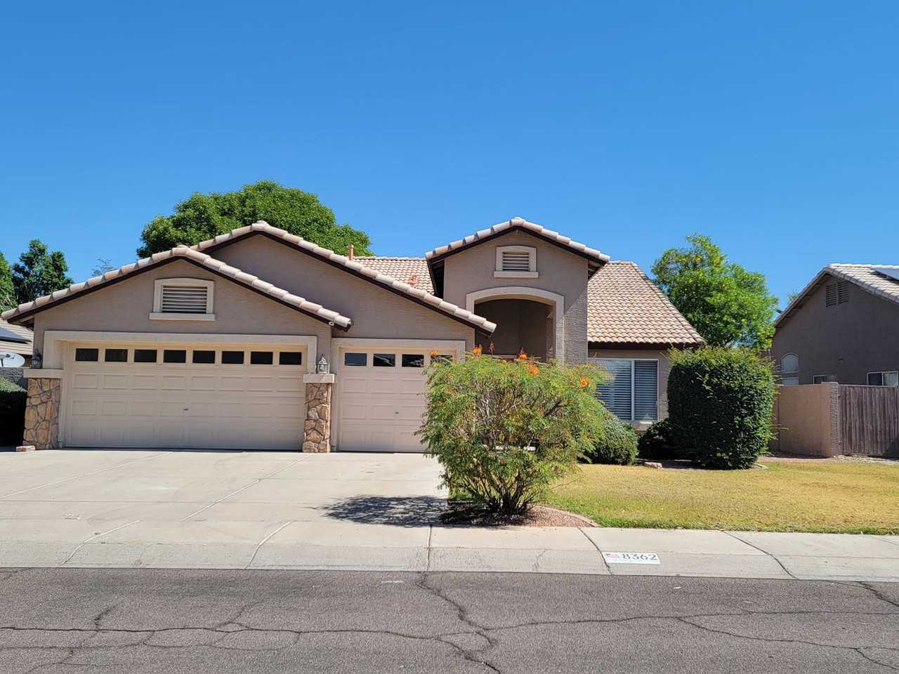 Remodeled-Upgraded single level house with 3 car garage in beautiful Bridlewood subdivision. 2 tone interior paint, tile plank flooring throughout, with carpet in the bedrooms. Custom 2" horizontal faux wood blinds, and stainless appliances in the kitchen. Great open floor plan with separate living and family rooms. Grass front and back yards with automatic sprinkler system. Just off the 101 Loop with easy access to the entire west valley, and only a few miles from Westgate, State Farm Stadium, and Desert Diamond Casino.