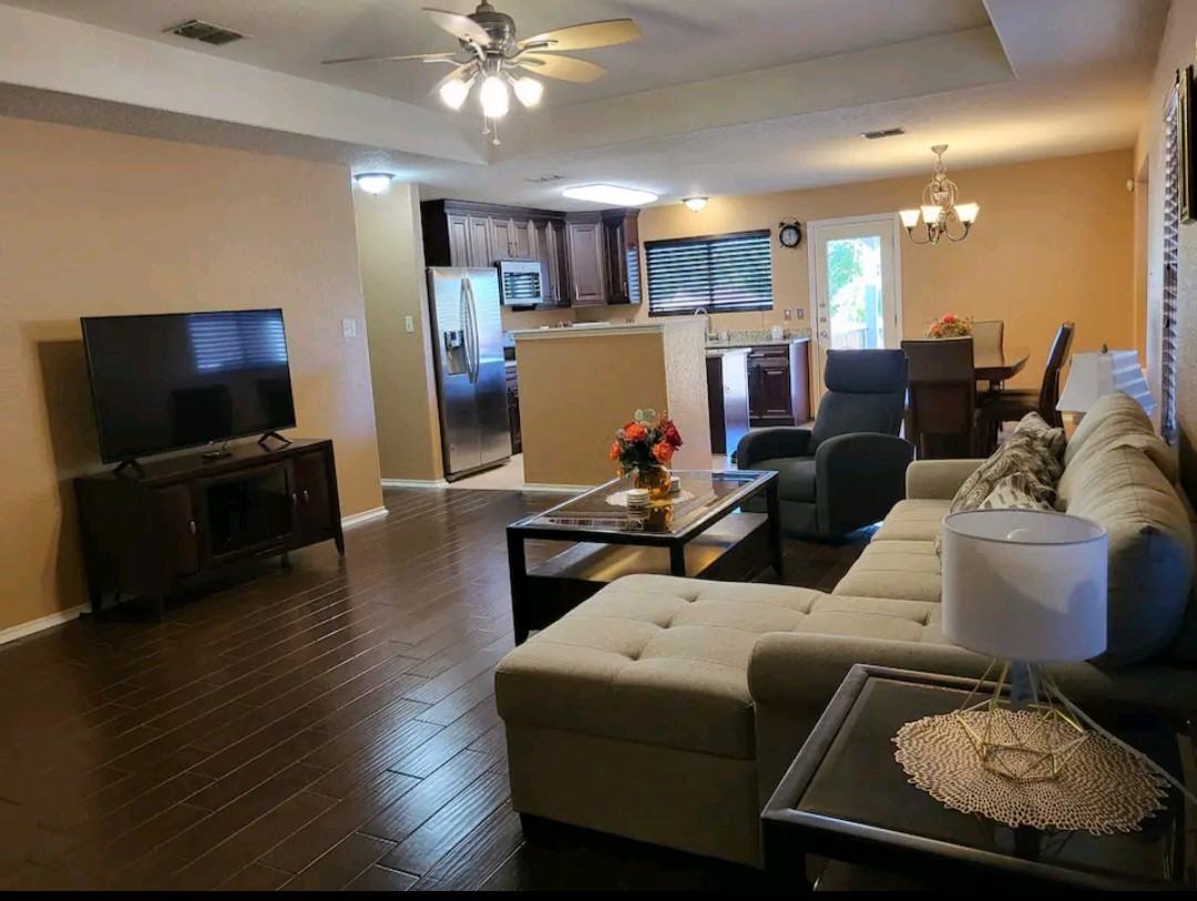 3 bedroom, 2 bath, 1,344 sqft with 2 car garage, front and back yards The property is close to Seaworld/Aquatica, hospitals, and Lackland AFB. It is also near movie theaters (Santikos Casa Blanca, Regal, and Westlakes) and several restaurants. Pets are welcome as the house is fully tiled. It's also close to freeways 410, 151 and 1604. 14 miles away from the airport and 17 miles away from the Riverwalk. Furnished home with attached garage. Utilities are included with rent with a cap of $200 on electricity. If there is an overage the tenant will be responsible for the overage and will be billed along with a copy of the CPS statement. Notify the host on how many pets. There is a non-refundable pet fee of $150 to disinfect property after each reservation added to the cleaning service (Covers up to two pets. Additional pets will incur an additional charge). It is the tenant's responsibility to pick up any pet waste from the yard. One-time cleaning fee of $250 non-refundable.