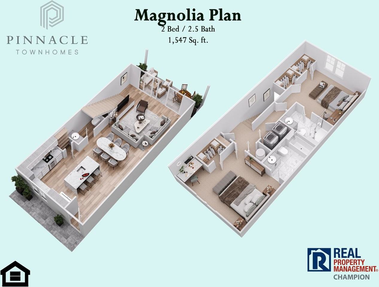 Magnolia Floor Plan Units available from $1,900/mo. to $2,050/mo. with available discounts, promotions and concessions applied. Contact us for details. The Magnolia Plan is a 2 BD/2.5 BA luxury townhome located in the newly constructed community of The Pinnacle Townhomes. The lower level offers an open concept floor plan for the main living areas. The kitchen includes granite counters, ample cabinets, full sized pantry and is anchored by an island with a breakfast bar and pendant lighting. All appliances are stainless steel, and the stove and refrigerator are WiFi connected using the Samsung SmartThings App. Beautiful flooring flows seamlessly from the kitchen through the dining and living areas. A powder room is conveniently located on the main level. Expansive patio doors take full advantage of the natural light and allow access to the covered patio and private courtyard. The upper level features a master bedroom with two walk-in closets and a private full bath with step-in shower. The second bedroom includes a private bath with tub/shower combo. The laundry closet is conveniently located on the upper level near the bedrooms. Additional features of the Magnolia include recessed lights, ceiling fans and 2” window blinds throughout. Pinnacle Townhomes has some of the largest and best appointed rental units in the area. Make sure to schedule a showing with us to see for yourself. Schedule a Showing: https showmojo com 5ebd6c3076 listings mapsearch Pinnacle Virtual Tour: https my matterport com show ?m=79HETnaYnAQ We are an Equal Housing Opportunity Management Company and abide by the term of the Federal Fair Housing Act. Pets allowed with prior approval and required pet fees.