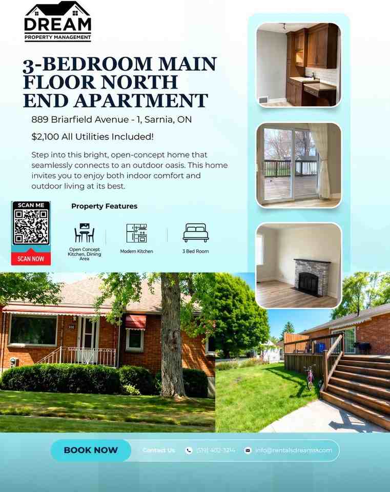 Bright & Spacious 3-Bedroom Main Floor North End Apartment – $2,100 All Utilities Included! Step into this bright, open-concept home that seamlessly connects to an outdoor retreat. Imagine stepping out from your dining area into a backyard oasis - perfect for gardening, relaxing, or entertaining under the sun. This home invites you to enjoy both indoor comfort and outdoor living at its best! Features you'll love: -3 Spacious Bedrooms - Filled with natural light and lots of closet space -Open-Concept Kitchen & Dining Area - Designed for connection, flow, and ease -Modern Kitchen - Featuring stainless steel fridge, gas stove, dishwasher, lots of cabinets, and counterspace -Stackable Washer & Dryer - Added convenience right at home Extra perks you'll love: -Patio Doors to a Spacious Deck with Roll-Out Canopy -Fully Fenced Shared Backyard with a Shed - Ideal for relaxing, gardening, or entertaining -1 Parking Space Included -All Utilities Included - Includes heat, hydro, and water -Non-Smoking Building - Clean and fresh environment -Pet-Friendly - Limited Pets Allowed (Restrictions apply) -Prime North End Location - Minutes to Highway 402, shopping, banking, and bus routes Location Highlights: *Schools: -Rosedale Public School (800m) -Northern Collegiate Institute & Vocational School (1.6 km) -Errol Road Public School (1.8 km) -Alexander Mackenzie Secondary School (2.4 km) *Healthcare: -Oridon Medical (350m) -Sarnia Dental Care (1.7 km) -Bluewater Health - Sarnia (2.3 km) -Good Doctors Sarnia (2.6 km) *Shopping & Amenities: -Metro (1.5 km) -Tim Hortons (1.8 km) -London Road Shopping Centre (3.3 km) -Lambton Mall (3.7 km) Tenant Requirements: (Only qualified applicants will be contacted!) -Online Application: www rentalsdreampm com -First and last month's rent + Key deposit -Credit check, Confirmation of income & References -Tenant's insurance with 2M liability Don't miss out - Fill out an application today and make this yours! -Email: **** -Call: 519-402-2154 -Online Application: www rentalsdreampm com Act fast - this won't last long! Submit your application today! *Disclaimer: Distances are approximate based on Google Maps. All information provided is deemed reliable but is not guaranteed and should be independently verified. Please note that all rental agreements must comply with the Residential Tenancies Act of Ontario.