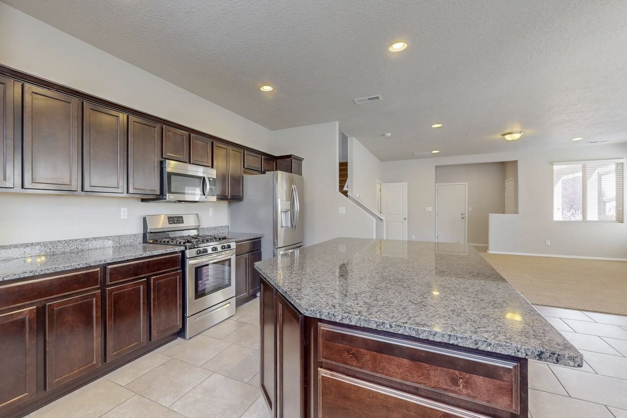 Welcome to your beautiful family home, located at the end of a cul-de-sac, connecting to a mature walking path. Conveniently located for work and other ABQ landmarks! Imagine yourself living in this home with a modern interior, while including some special upgrades, such as a landscaped backyard with custom pergola and raised garden beds, functioning laundry room, and built in garage shelving. The perfect design for the energy efficient renter looking for solar, electric car charging, and plenty of natural lighting. Total electric fee of $8/month! All appliances included. Spacious closets and storage areas as well. Is equipped with an awesome bonus loft upstairs, perfect for relaxing on movie nights. Large, open kitchen with ample counter space and substantial master bedroom with numerous furniture configuration options. New plush carpeting on the lower level and stairs as well.