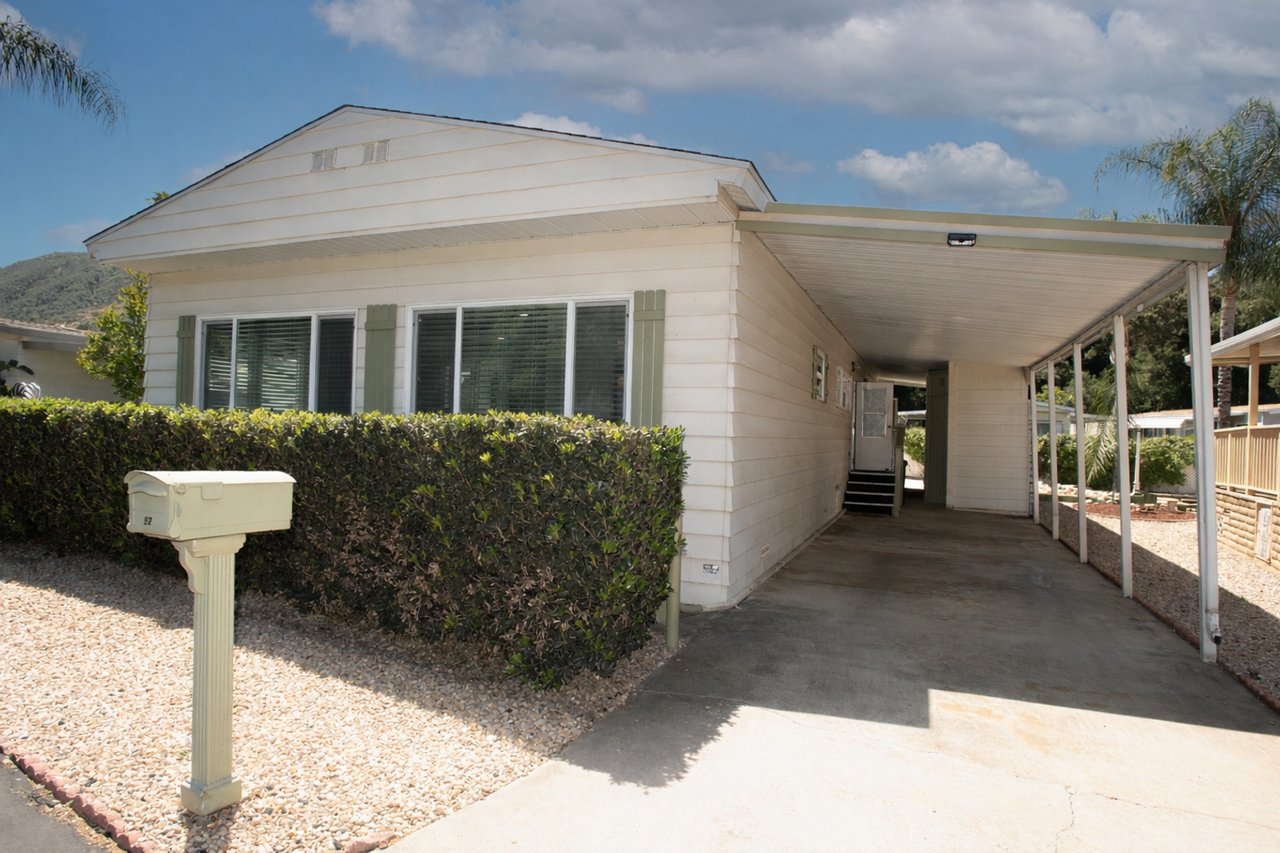 Experience easy, comfortable living in Champagne Village, a gated 55+ community connected to Lawrence Welk Resort. This updated home is move-in ready and built for simple, low-maintenance living. What stands out right away: Front porch with a beautiful rose garden, Bright interior with new luxury vinyl plank flooring. Clean, modern finishes throughout. Key features: 2 bedrooms and 2 remodeled bathrooms. Spacious primary suite with washer and dryer in the closet, New luxury vinyl plank flooring throughout, Electric stove with double oven, Whole house fan for efficient cooling, Outside, you get a yard with grass for the grandkids kids to play, plus two detached storage units with built-in shelving. Easy to maintain and easy to lock up when you travel.
