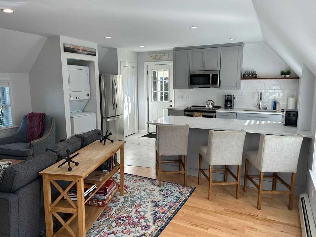 Downtown Dover renovated apartment with private entrance! This second-floor unit offers an open-concept kitchen and living area featuring quartz countertops and maple hardwood floors. Spacious primary bedroom includes a large walk-in closet and reading nook. Fully remodeled throughout with an efficient on-demand heat and hot water system. In-unit laundry. Private shared backyard. Off-street parking for two small cars plus additional street parking. Available furnished as shown. Tenant responsible for heat, electric, cable/Wi-Fi, and snow removal. Landlord covers water/sewer and lawn care. No pets, no smoking. One-year lease required. Credit, background, and income verification required. $49 Application Fee.