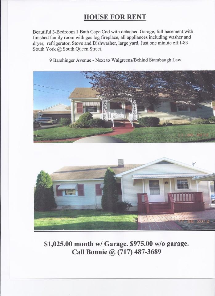 Beautiful 3-Bedroom cape cod with detached garage, full basement with finished family room with gas log fireplace, stove, refrigerator, dishwasher, washer and dryer and large back yard.Just 1 minute off I-83 south york @ South Queen ST. Next to Walgreens/Behind Stambaugh Law. Apply at Turbo Tenant: rent.turbotenant.com/properties/9-barshinger-ave