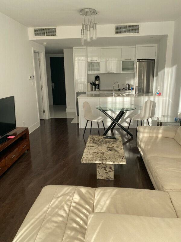 901 rue De La Commune E, Montreal, H2L 0B9, QC, CA. Unit 816 Fully furnished and all inclusive 1 bedroom Semi-Penthouse in old port with amazing view. Rent includes: Electricity; Heating; Hot water; Condo fees; Internet (WIFI unlimited); Bell Five TV; Furniture as listed below; Full length Balcony (full length of condo) Pet allowed with restrictions & permission; 10 foot ceiling & approx. 650 square feet; 180 degree views of water & city views; Facing SouthWest - sunlight all day; Granite countertop & backsplash throughout apartment Furniture included : - Nantuzzi sectional couch (as pictures) - Glass dining table with 2 chairs (for brand new as pictured); - Glass high bar table with 2 high chairs (as pictured); - Granite coffee table (as pictured); - Rosewood tv stand with 43 inch tv (as pictured); - Rosewood dresser (as pictured); - Standing bedroom Lamp (as pictured); - Standing wood Mirror; - Living room glass side table; - Queen size bed & mattress (tenant must bring their own sheets); - Washer & Dryer; - Stainless steel fridge; stove; microwave; Dishwasher; Coffee machine; - Central A/C Private balcony with water views; city views; Facing SouthWest - tons of light! Front closet is a double closet (last picture shown); Bedroom has a walk-in closet (in bedroom pictures); Floor to ceiling windows; Reinforced concrete building; Building amenities include: indoor pool; outdoor pool; urbain chalet; gym and yoga room; Parking available for extra $ Utilities Included: - Heat - Water - Electricity