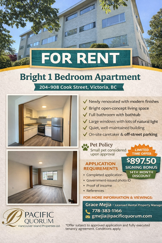 204–908 Cook Street, Victoria, BC Experience comfortable and convenient living in this bright, newly renovated one-bedroom, one-bathroom apartment located in a quiet, well-maintained building on Cook Street. This thoughtfully updated home features an open-concept layout with modern finishes, large windows that bring in abundant natural light, and a full bathroom complete with a bathtub. Residents benefit from the support of an on-site caretaker and the availability of off-street parking. A small pet may be considered upon approval, making this an excellent option for those seeking a welcoming and flexible rental environment. Ideally situated near downtown Victoria, this home offers easy access to cafés, restaurants, shops, parks, and public transit—all while maintaining a calm residential setting. Pet Policy: Small pet considered upon approval. All applicants must submit a completed application prior to scheduling a viewing. Offered for rent on behalf of the owner by Pacific Quorum Vancouver Island Properties Ltd. Applicants must provide a completed application, government-issued photo ID, proof of income, and references. For more information or to book a viewing, contact: Grace Mejia 1-778-383-1166, Licensed Rental Property Manager **** Limited Time Offer – Signing Bonus of 14th month recieving $897.50 Discounted on rent. Offer subject to approved application and fully executed tenancy agreement. Conditions apply. The property offers spacious one-bedroom units, with easy access to Cook Street Village, Downtown Victoria, Beacon Hill Park, and Dallas Road. Additionally, it features a rooftop deck recently replaced in 2017 with great views. Roof top patio for tenants to use. On site laundry facility.