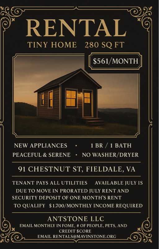 Property Id: 1844684 Tiny Home for Rent - 91 Chestnut St, Fieldale, VA Discover comfort and simplicity in this newly renovated tiny home nestled inTiny Home for Rent - 91 Chestnut St, Fieldale, VA Discover comfort and simplicity in this newly renovated tiny home nestled in the quiet town of Fieldale, VA. Perfectly designed for minimalist living, this cozy space offers just under 300 sq ft of efficient living with modern finishes and thoughtful touches throughout. - 1 Bedroom / 1 Bathroom - Brand New Appliances - New flooring -WiFi-Controlled A/C Unit for customized climate comfort -$562/month rent - Single Occupancy Only -Steep Shared Driveway with other tenants -Peaceful surroundings with convenient access to nearby amenities Whether you're downsizing or simply love the charm of tiny home living, this home offers the perfect blend of privacy and practicality. Address: 91 Chestnut St, Fieldale, VA Available Now