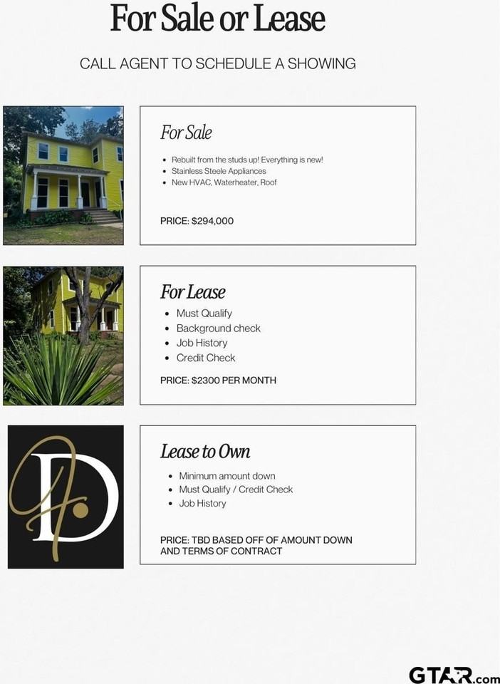 Property Status: Active FOR RENT/LEASE---MUST QUALIFY---BACKGROUND CHECK, PROOF OF EMPLOYMENT AND WAGES Step Back in Time—With All the Comforts of Today Nestled next to the historic district in charming Palestine, Texas, this beautifully restored 6-bedroom, 3-bath, 2-story pier-and-beam home is a perfect blend of vintage character and modern convenience. Surrounded by mature trees, the property offers a peaceful, shaded retreat while keeping you just moments from the heart of town. Originally built in 1915, this gem has been lovingly taken down to the studs and completely remodeled—preserving its nostalgic charm while bringing it fully up to today’s standards. Every detail has been thoughtfully updated, including: New roof, plumbing, and electrical Spray foam insulation (walls and “igloo” for year-round efficiency) New HVAC inside and out Stylish new flooring, fixtures, and appliances From the moment you step inside, you’ll feel the warmth of the home’s history paired with the ease of modern living—like a brand-new home wrapped in classic Palestine charm. OWNER FINANCING AVAILABLE – making it easier than ever to make this historic treasure your own. Lease Option Available $2300 per month (must qualify) Office Phone: (855) 727-4255 Copyright © 2026 Greater Tyler Association of Realtors. All rights reserved. All information provided by the listing agent/broker is deemed reliable but is not guaranteed and should be independently verified.