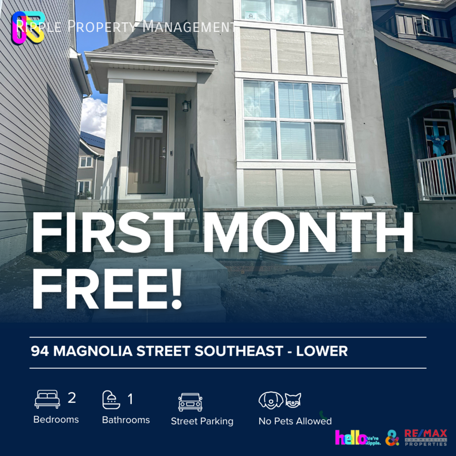 FIRST MONTH FREE! AMAZING 2 BEDS/ 1 BATHS LOWER UNIT ONLY! VIDEO TOUR: https youtu be UA2O9leEFxc Interested in this unit? BOOK HERE: https showmojo com 79c3e9f0b2 l Use our automated booking system, ShowMojo, to schedule a showing. You'll receive a response within a few hours with available dates and times. Note: Showings are conducted in groups, not one-on-one. IMPORTANT INFORMATION: - Utilities Included: No Utilities Included - Parking: Street Parking - Pets Allowed: No Pets Allowed - Smoking: Non-Smoking - Storage Included: No - Laundry: In- Suite Laundry UTILITIES: Shared Utility Unit: This unit shares a utility meter with another unit. Utility costs will be split between the two units with 60% of the cost being paid by the main (upper) unit and 40% of the cost being paid by the secondary (lower) unit. A monthly utility deposit of $350 for the main unit and $225 for the secondary unit will be charged for the first three months of the tenancy. UNIT FEATURES: - Open-concept living room with windows allowing for natural light - Spacious layout, perfect for relaxing or entertaining - Sleek and modern kitchen with all appliances for a contemporary look - Kitchen features plenty cabinet storage to keep everything organized - Open-concept design flowing into the living space, perfect for entertaining - Main bedroom features a spacious closet providing ample storage for clothing and accessories - Bright and airy bedrooms with large windows, providing plenty of natural light - Includes window coverings for privacy and light control - Cozy yet functional layout, perfect for restful nights COMMUNITY FEATURES: This property is located in a vibrant community with easy access to: Steps from Amenities: Close to grocery stores, coffee shops, and restaurants Transit & Accessibility: Easy access to public transit Fitness & Wellness: Nearby gyms, yoga studios, and river pathways for outdoor activities A LEADER IN CALGARY PROPERTY MANAGEMENT This property is managed by Ripple Property Management—a name synonymous with quality and trust. With 15 years of expertise and a commitment to excellence, we make property management and renting a seamless and enjoyable experience. View more properties managed by Ripple Property Management: https showmojo com 79c3e9f0b2 l