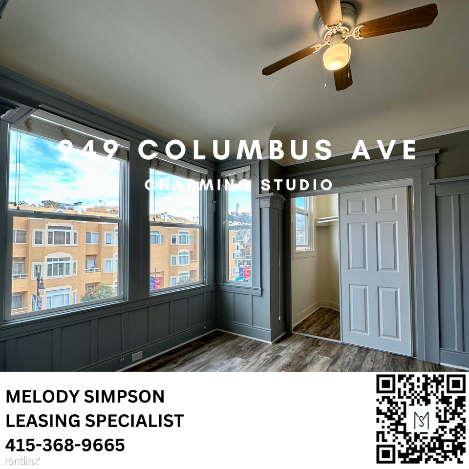 Please text Melody @ 415-368-9665 for a private tour. PROPERTY DETAILS: Address: 949 Columbus Ave. Rent: $2150 Bedrooms: Studio Bathrooms: 1 Parking: STREET ONLY Utilities Included: Water & Trash Property Type: Flat Laundry: Nearby Pets: OK (Kitty or Small Dog) Lease Term: 1 Year Available Date: NOW Description: This charming studio is located in the heart of North Beach. Views of Coit Tower, close to Washington Park, walk to Trader Joe's grocery store, Brioche Bakery, and everything you need! No car is necessary. Nearby boutique shopping, restaurants, cafés, entertainment, and transportation are just a block away. UNIT FEATURES: • BRIGHT AND SUNNY space. • Coit Tower Views • Lots of Windows • Huge Closet • Spacious Studio • Sunny and Bright • Excellent access to public transit • Street Parking with SFMTA permit Offered by: Melody Simpson Leasing Specialist CA DRE#01248225 415.368.9665