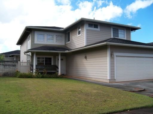 Simple yet elegant, this home has lots of open space, and privacy too! Ground level floor features beautiful engineered wood floors throughout Second floor is carpeted in lush wall to wall 20' ceilings make entry and living room bright and breezy Upgraded roomy kitchen with peninsula counter enabling easy access to large family room and separate dining area First floor bedroom easily convertible to home office with private half bath Upstairs the wide open loft has two bedrooms and one full bath on one end and a master bedroom suite on the other Bedroom has portable AC unit and 100 sq foot walk in closet Bathroom offers private double sink vanity, glass wall shower, separate toilet area and deep bathing tub Separate laundry room includes top load washer with front load dryer Two car garage has storage closet and shelving Large fenced yard surrounds home on side and rear offering a safe gated area for your family pets Shaded patio is perfect for BBQ and casual dining Recreation center membership is included featuring sparkling accessible pool, toddler swim area, picnic gazebos, outdoor playgroung, and indoor basketball and volleyball courts. Home is available now, showings are by appointment only. Text or call Sue Bauer 808-387-3483 email: sue@mhprops.net