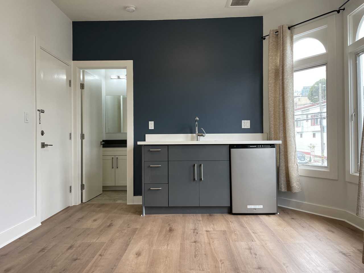 On second floor, one room studio, one bathroom, one wet bar, newly remolded, new plumbing, new electrical, new floor, new paint, quality materials, lot of nature light, near bart, bus stations, convenient transportation, pay fee laundry in the building. Good for single student, professional.