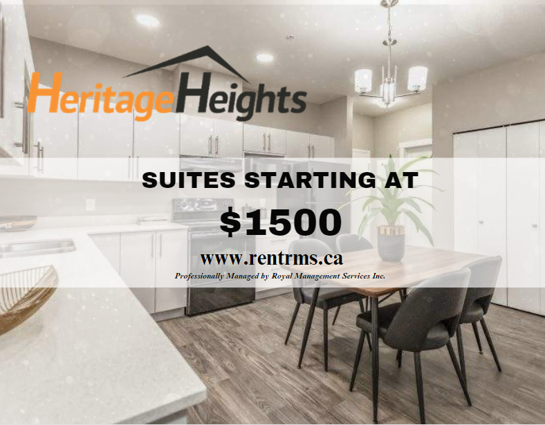 RENTS STARTING AT $1500.00 A MONTH! Rent with us in the vibrant community of Blairmore, and indulge in the modern rental life with a pet-friendly open concept design featuring: In-suite laundry, wood-style flooring, quartz countertops, in-suite air conditioning, private balconies, full appliance package, window coverings, heated underground parking and much more. *some conditions may apply Call now to book your showing* 306-202-6053 Heritage Heights offers 1 and 2 bedroom, pet friendly, and air-conditioned apartments in the quiet area of Blairmore. This contemporary new apartment complex is within walking distance of shopping, groceries and entertainment with local access to city transit. These open floor plans provide all of the amenities expected from a premium apartment complex. You will enjoy the first-class finishes provided at the exceptional value of a new development pricing. Building - 1 and 2 bedroom apartments featuring 1 and 2 bathroom layouts. - Building keyless door entry system - Secured building with intercom system - Video surveillance - Each floor serviced by an elevator - Underground or surface parking stalls available - One exterior deck or patio per unit - Large green space area next door Vibrant Suite - Open concept, modern layouts and air conditioning - Luxury wood-style flooring - Premium cabinetry with soft close hinges and Quartz countertops - Large closets - Range hood with exterior exhaust - Double basin stainless steel kitchen sinks - 6 stainless steel appliances - Full-size in-suite laundry For more information, please visit us online at [https www newsaskatoonrentals ca ](https www newsaskatoonrentals ca ) Not what you're looking for? Visit www rentrms ca for other Apartment options. Professionally managed by Royal Management Services Inc. (Licensed Broker). Rates, deposits, and incentives are based on applicable lease terms, approved credit, and are subject to change without notice (some conditions apply). Photographs are for advertising purposes only and may not be of the actual suite available.