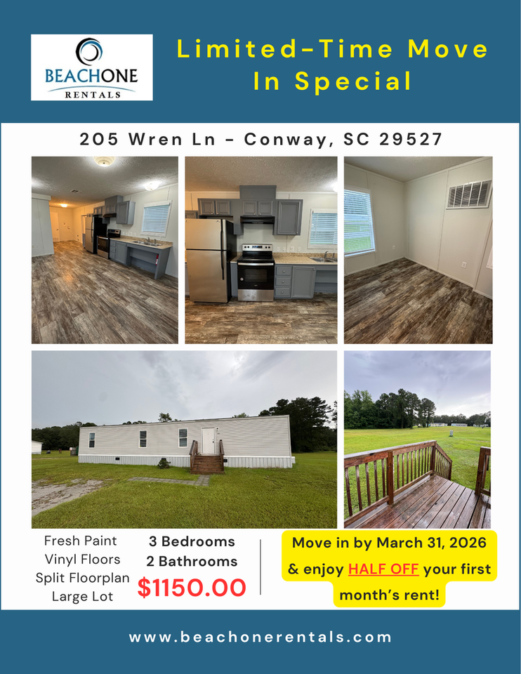 | 3BR/2.0BA | 3 bed | 2 bath | $1,150 /mo | 1 unit available | **LIMITED TIME MOVE IN SPECIAL** Move in by March 31, 2026 and enjoy HALF OFF your first months rent! Welcome home to this well-maintained 3 bedroom, 2 bathroom single wide manufactured home in the quiet Cardinal Estates community. Featuring a durable laminate flooring throughout, this home offers a split bedroom floorplan for added privacy and comfort. Enjoy the outdoors on a large back deck overlooking a generously sized lot - perfect for relaxing after a long day! Additional highlights include full-size washer and dryer hookups, an open living room and a functional kitchen layout. Trash included, on-site. Tenant responsible for all utilities, landscaping and renters insurance. Dogs considered on a case by case basis. Additional fees will apply. Annual lease required. Resident Benefits Package (RBP) Available! Application Fee: $50 per adult -- For more details, please visit our website at www beachonerentals com All residents have the option to be enrolled in our exclusive Resident Benefits Package, which includes liability insurance, credit building to help boost your credit score with timely rent payments, identity theft protection, HVAC air filter delivery (where applicable), a move-in concierge service for seamless utility setup, a top-tier resident rewards program, on-demand pest control, and more! Contact our office for more details!** |