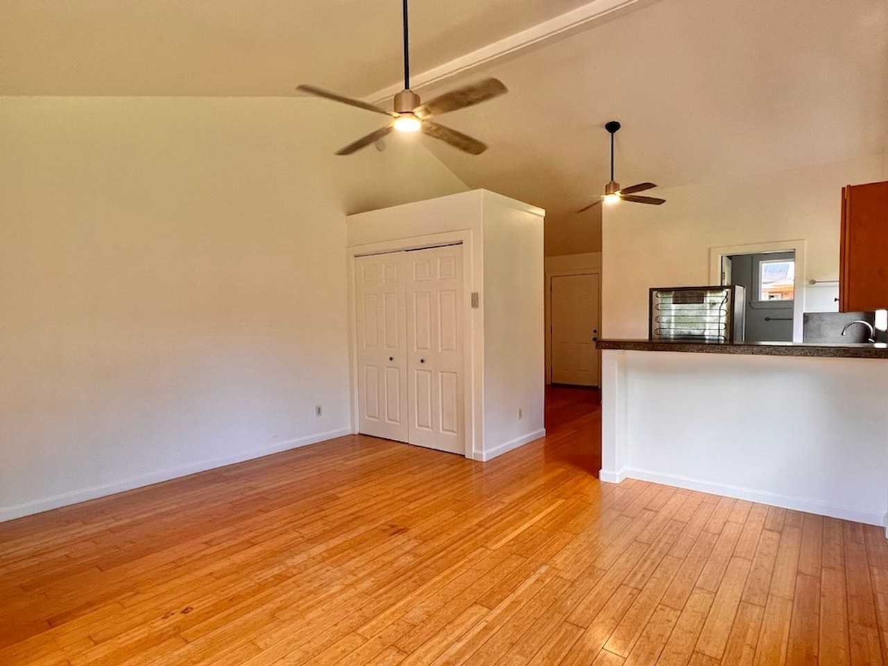 This upstairs studio is tucked deep inside Hanapepe Valley. The studio has vaulted ceilings in the living area which creates an added sense of space. The kitchen is highlighted by concrete countertops and a breakfast bar with fridge. There's also a large shelving unit and closet for your belongings. A small lanai off the living area creates some outdoor space. The remodeled bathroom features tiled floors and a beautifully-tiled shower with glass accents. Rent includes electricity and water but other utilities are the tenants' responsibility. Sorry, no pets. Renters insurance is required. Rent: $1,900/month Security Deposit: $1,900 Available: April 21, 2025 Lease: One year then continues month to month Contact Taba Realty & Development, LLC at (808) 742-7110 for more details. To schedule a showing, first submit an application on our website at www tabarealty com kauai-rentals