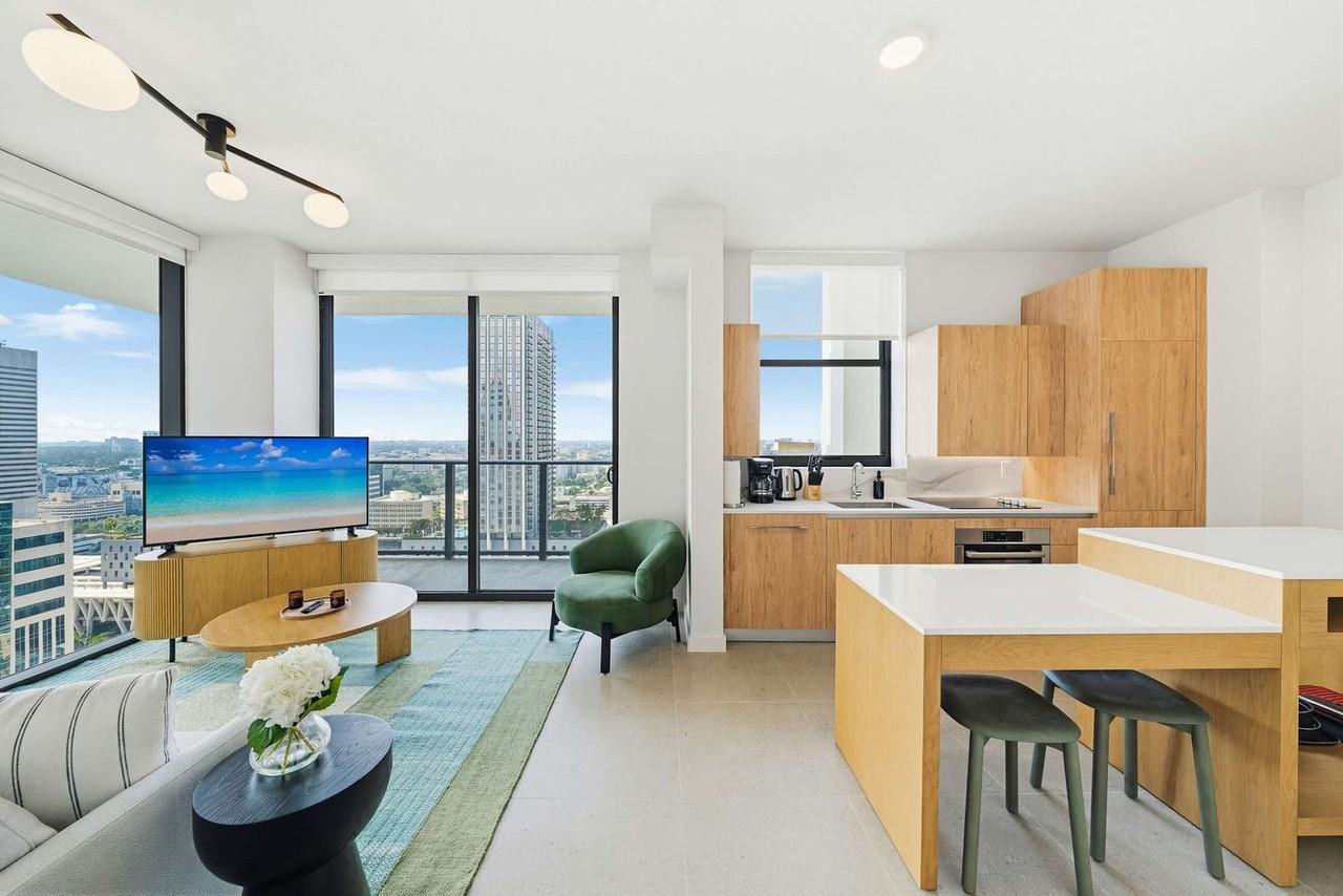 | Studio | Studio | 1 bath | Experience an urban getaway in this apartment located in the heart of Miami Worldcenter. Feel at home in this stylish apartment. This apartment offers luxury finishes throughout. Enjoy the private balcony, private sleeping area with a comfortable queen-size bed and a sofa, a smart TV, a kitchenette, a modern bathroom, and central air conditioning. Enjoy the rooftop pool with breathtaking skyline views and the state-of-the-art fitness center. Step outside and you’ll find top restaurants, high-end shopping, and vibrant entertainment. With seamless access to Brightline and the Metromover, everything is within walking distance. Nearby attractions include Bayside Marketplace, Kaseya Center, Skyviews Miami, Bayfront Park, Pérez Art Museum, Frost Museum of Science, Miami Riverwalk, and Brickell & Mary Brickell Village. Smoking is strictly prohibited on the entire property, including inside the apartment and on the balcony. A $300 fine applies if violated. Reservations must be made by a person who is 21 years old, and the reservation holder’s presence is required throughout the entire stay. Standard check-in is at 4:00 PM, and check-out is at 11:00 AM. If you need a late check-out, contact us 24 hours in advance. Subject to availability, we can arrange a late check-out until 12:00 PM for an additional $50. Failing to meet the checkout time may incur an extra night charge. Includes a dedicated workspace and high-speed Wi-Fi. | |||