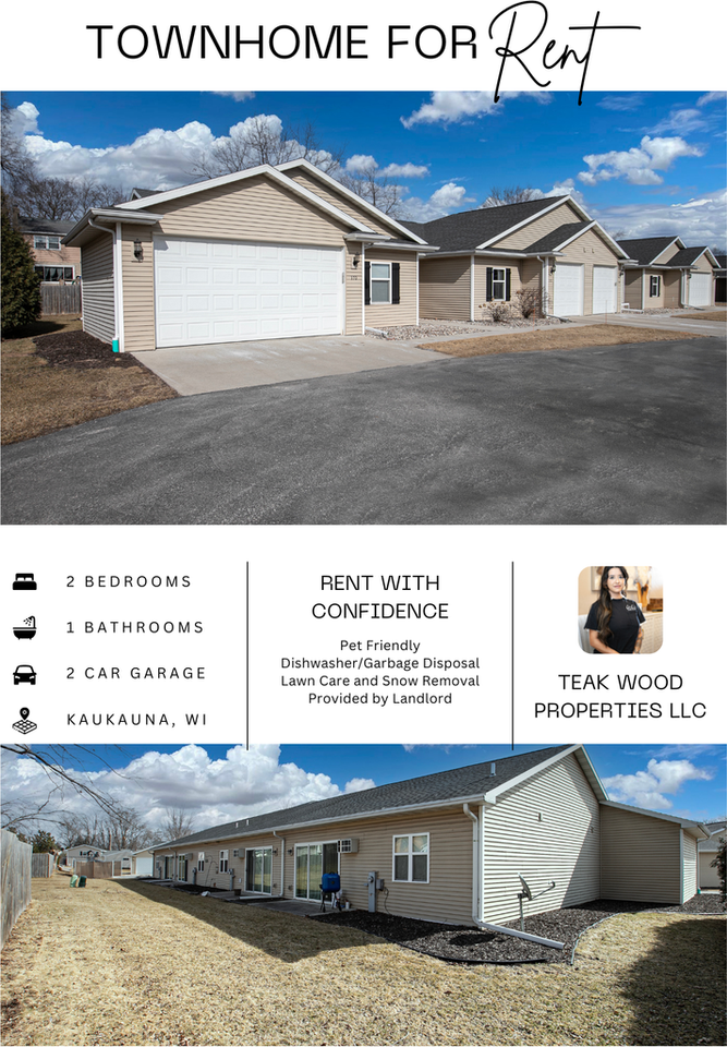 Beautiful Two Bedroom Unit in Kaukauna available 3/1/26 Spacious luxury townhome with 1 car garage included Flush entry walkways - no stairs **Showings will be available for APPROVED Applicants only** Must apply first to schedule showing - REQUIREMENTS: 600+ Credit Score, No Evictions, Proof of Income, Great References - Dishwasher and ac unit included - Listed by Private Landlord - Conveniently located minutes from kwiktrip, Highway 41, NU Cafe, Kaukauna Disc Golf Park -Security Deposit $1425/Rent $1425 - No utilities included - Laundry Hookups -Non Furnished Unit - Lawn mowing and snow removal services provided by landlord - Pet friendly! (Accepting of all breeds)