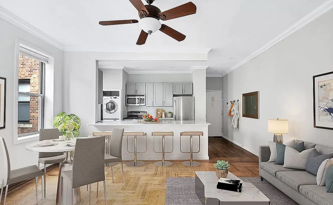 Welcome home to this one bedroom, one bathroom top floor apartment located in Astoria. This spacious corner unit was tastefully renovated and features a contemporary design while still maintaining its original pre-war charm. As you enter the unit, you are welcomed by an entry foyer that leads you into the space which offers dual exposures and the original hardwood floors throughout. The open modern chef?s kitchen blends well into the living room and features an oversized kitchen island, white marble carrara countertops, custom gray cabinetry, a glass tiled backsplash, stainless steel appliances and a washer/dryer in unit. The spacious living area is great for entertaining and dining and features two large windows offering natural light. There is a hallway that leads into the bedroom that is outfitted with two large custom closets and is directly adjacent to the windowed renovated bathroom. The bathroom was redesigned and features white porcelain herringbone tiles and a marble top bathroom vanity. The large north facing bedroom has three large custom built closets and offers lovely tree top views. The Astoria Lights development features four pre-war co-op buildings that have been converted to modern homes while still maintaining its original pre-war finishes. This much sought after development offers an array of amenities including a landscaped roof deck with 360 views, a shared multi-zoned common courtyard featuring a Bocce court and BBQ area, a resident?s lounge, co-working hub, kid?s play area, state of the art fitness center, private storage, bike room and common laundry room. The complex is also conveniently located in the heart of Astoria where you can explore many popular restaurants, shops, cafes and nightlife. The N/W train lines are minutes away with easy access to Manhattan & Brooklyn. The Astoria waterfront park is also a short distance