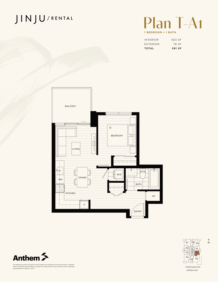 | A1 | 1 bed | 1 bath | 503 sqft | $2,250 /mo | The A1 is a thoughtfully designed 1-bedroom home in the JINJU tower that offers smart functionality with elevated style. With 503 square feet of interior living space and an additional 78-square-foot private balcony, this layout delivers the perfect balance of efficiency and comfort. The open-concept kitchen flows seamlessly into the dining and living areas, creating a welcoming space ideal for everyday living or hosting friends. The kitchen includes a full appliance package (including dishwasher) and ample cabinetry, maximizing both storage and usability. The bedroom comfortably accommodates a queen-sized bed and is positioned for privacy away from the main entry. The well-appointed bathroom is centrally located for convenience, and the in-suite washer and dryer add everyday practicality. One of the standout features of the T-A1 is the private balcony, offering valuable outdoor living space — perfect for morning coffee, fresh air, or unwinding after a long day. Ideal for professionals or couples seeking modern, transit-connected living in West Coquitlam, the A1 floorplan offers an efficient layout without compromising comfort. Smart design. Private outdoor space. Everyday convenience. |