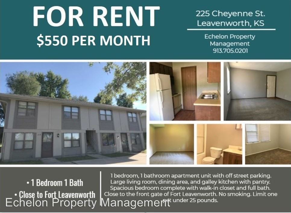 | Cheyenne - 225 Cheyenne | 1 bed | 1 bath | 500 sqft | One Bedroom Apartment Close to Fort Leavenworth - 1 bedroom, 1 bath unit has been freshly painted with off street parking. Large living room, dining area, galley kitchen with walk in pantry. Spacious bedroom is complete with large walk in closet and bath. Less than a mile to the front gate of Fort Leavenworth. No Smoking. Pet upon owner approval. |