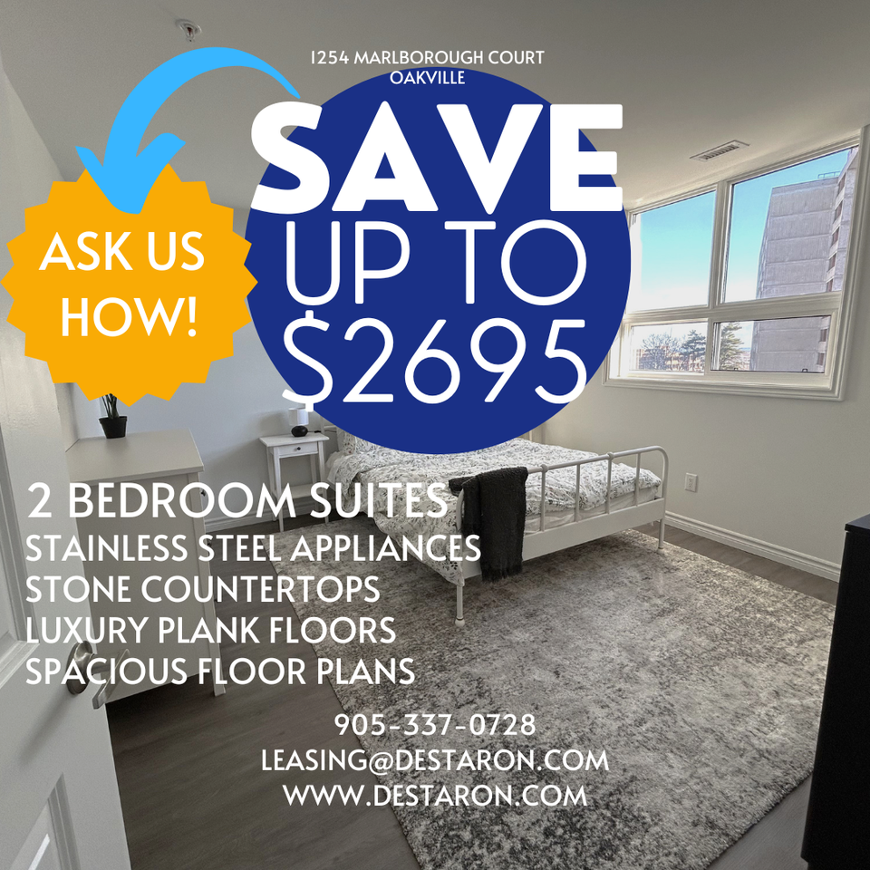 Ask about our move-in specials! Marlborough Manor – Your Ideal Home! Discover Marlborough Manor, where exceptional living meets comfort, convenience, and community. We offer a unique standard of living and a commitment to our residents that sets us apart. Property Highlights: - On-site Management & 24/7 Emergency Assistance: Our dedicated team is here to assist you anytime. - Modern Lobby, Elevators, and Hallways: Enjoy a stylish, well-maintained environment. - New Laundry Facilities: Convenience with front-loading washers and dryers, and a Mobile Payment App. - Ample Indoor Parking: Secure parking facilities available (fees apply). Prime Location: - Easy Access to Major Highways: Minutes from the QEW, 403, 407, and 401. - Public Transit Convenience: Bus stop at the corner, Oakville GO station just 1 km away. - Retail & Dining at Your Doorstep: Plaza with grocery, dining, medical, dental, and pharmacy across the street. - Shopping Galore: Walk to Oakville Place Mall, with over 100 retailers. Nearby McDonald’s, banks, and more. - Education Hub: Close to Montclair Elementary School, White Oaks High School, and Sheridan College. - Green Spaces & Recreation: Nature at McCraney Valley Park across the street, with Trafalgar Memorial Hospital nearby. The Destaron Difference: - Family-Owned & Operated for 35+ Years: We prioritize relationships with our employees and suppliers for exceptional service. - Well-Maintained Suites: Each suite is cleaned, restored, or fully renovated before your move-in. - Responsive Maintenance Team: We address issues promptly with 24/7 accessibility during emergencies. - Proactive Maintenance: Regular inspections ensure your safety and security. - Eco-Friendly Living: We're committed to energy-saving initiatives for a "green" living environment. Experience the Destaron difference for yourself. Contact us today to learn more and schedule a tour of your future home.