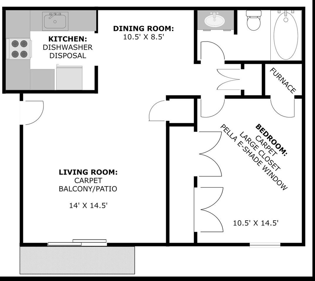 - Spacious one-bedroom, one-bath apartment